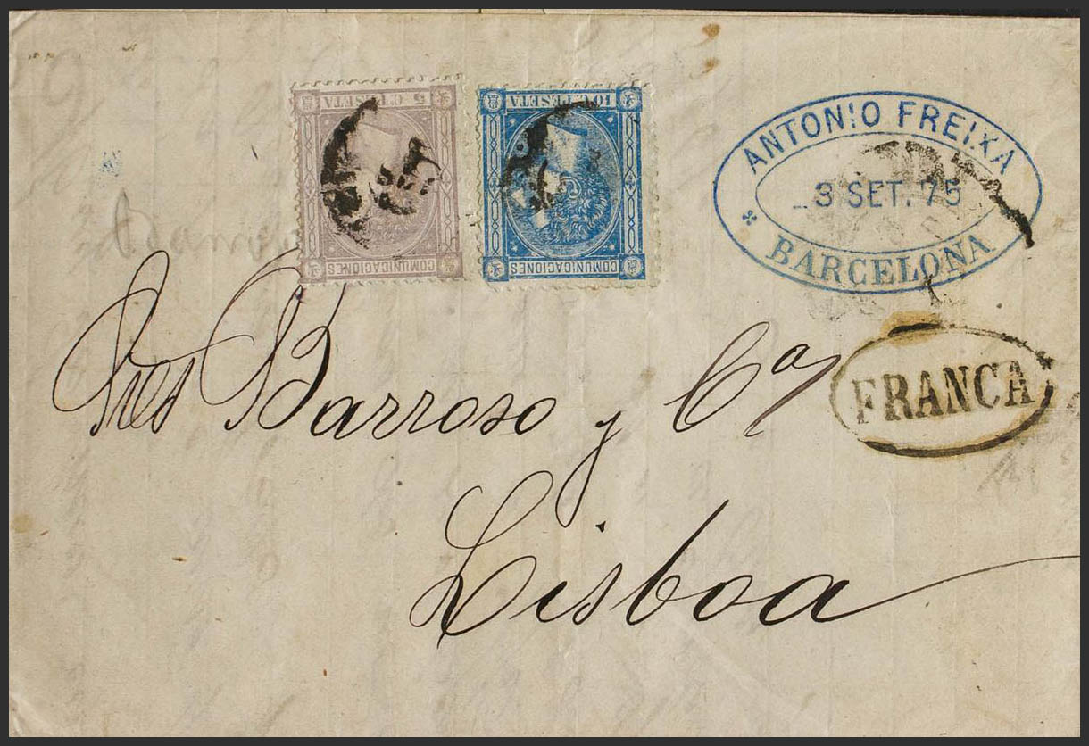 163, 164. 1875. 5 cts lilac and 10 cts blue. BARCELONA to LISBON (PORTUGAL). Postage of 15 cts completing the rate of 50 mils or 12.5 cts of August 1867, the new rate of 10 cts already in force since July 1, 1875. MAGNIFICENT AND EXTREMELY RARE.