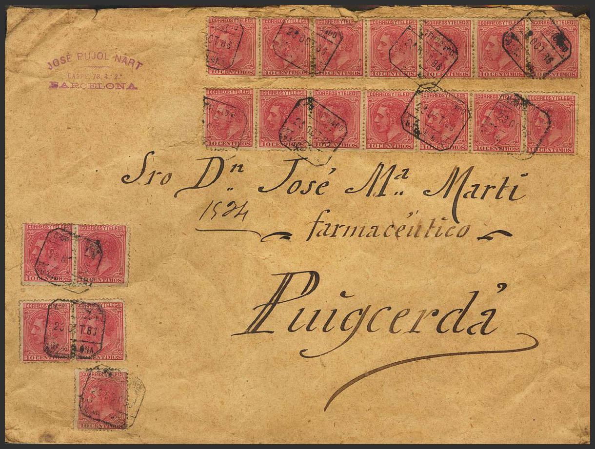 202(19). 1886. 10 carmine cts, nineteen stamps (two stamps detached). Certificate from BARCELONA to PUIGCERDA (GERONA). On the back arrival, seals and receipt signature. MAGNIFICENT AND VERY RARE, SPECTACULAR POSTAGE.