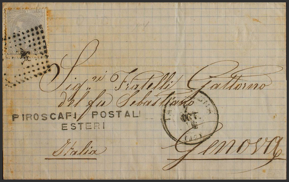 English 204. 1879. 25 gray cts. TARRAGONA to GENOVA (ITALY). On the front mark PIROSCAFI POSTALI / ESTERI. MAGNIFICENT AND EXTRAORDINARILY RARE.