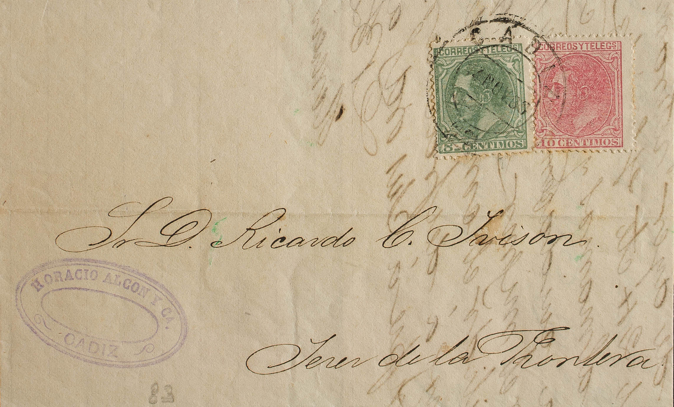 201, 202. 1883. 10 cts and 5 cts. CADIZ to SHERRY. MAGNIFICENT AND UNUSUAL COMBINATION TO COMPOSE THE RATE OF 15 CTS.