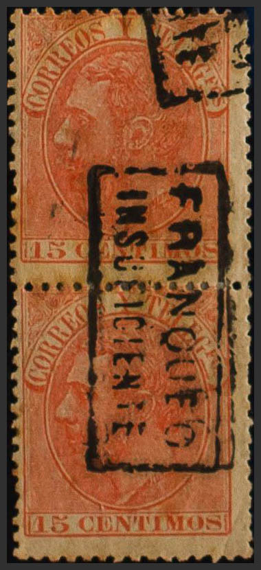 English 210(2). 1882. 15 cts orange, vertical pair. POSTAGE INSUFFICIENT postmark, in black. MAGNIFICENT.