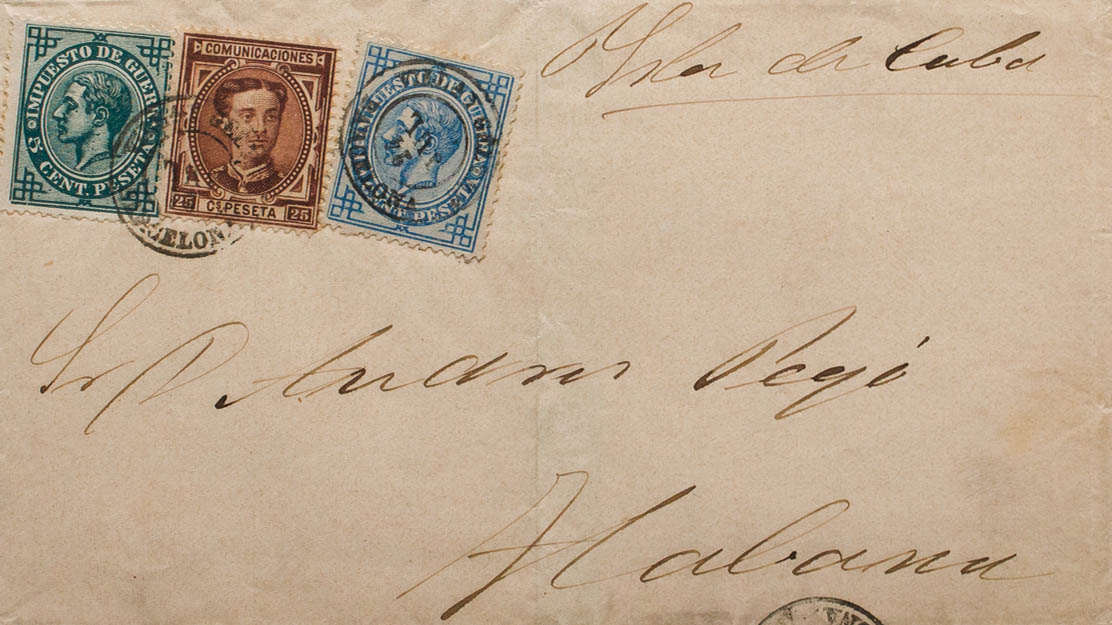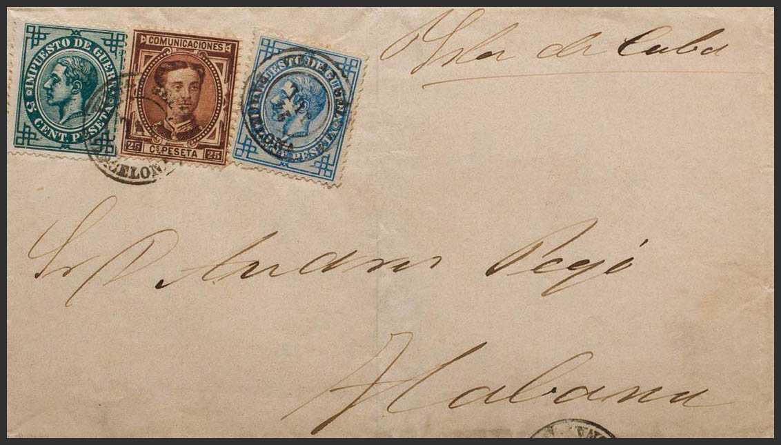 177, 183, 184. 1877. 25 cts chestnut, 5 cts green and 10 cts blue. VILANOVA AND LA GELTRU to HAVANA (CUBA). Postmark VILª Y GELTRU / BARCELONA. MAGNIFICENT AND VERY RARE COMBINATION OF POSTAGE.