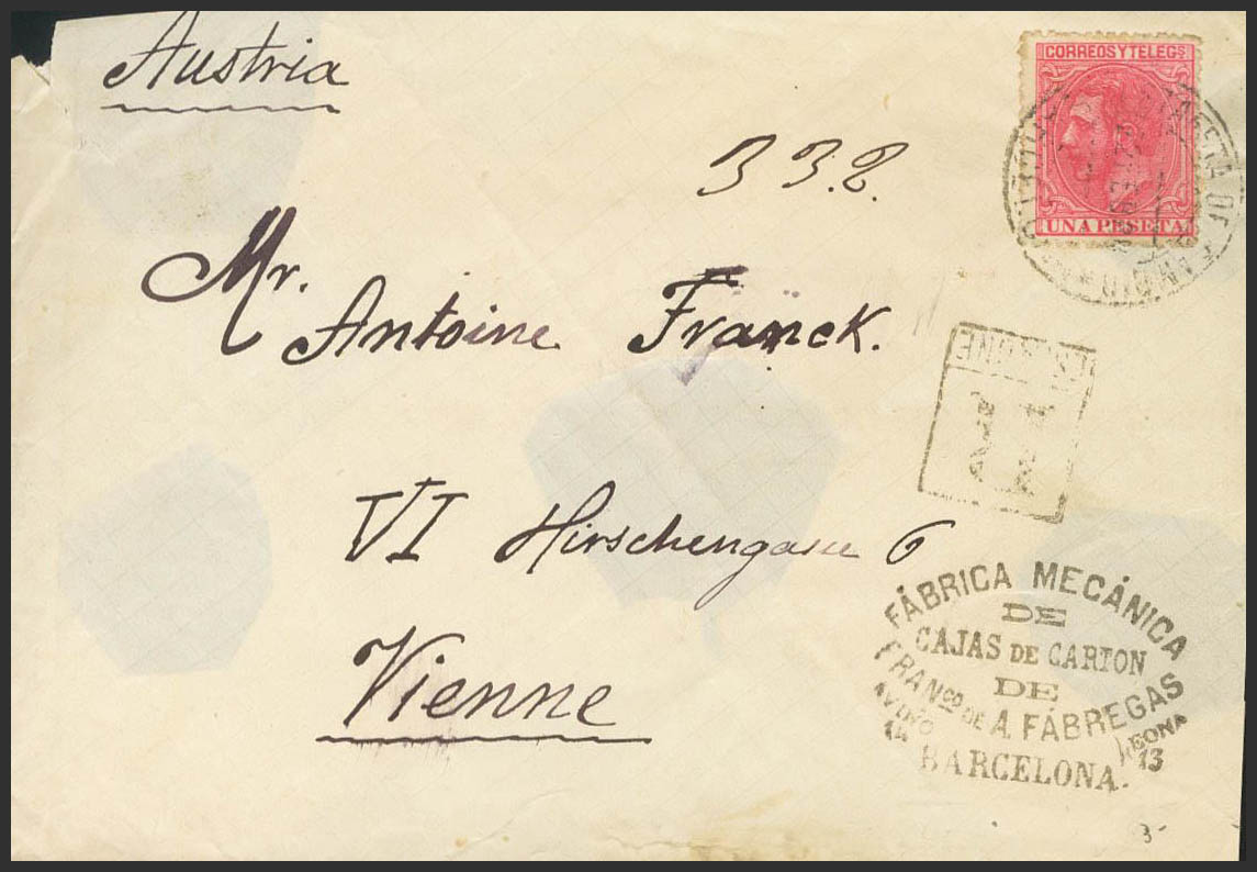 207. 1889. 1 pts pink. Certificate from BARCELONA to VIENNA (AUSTRIA). Arrival on the back (seals removed, only indicated for information). MAGNIFICENT AND RARE.