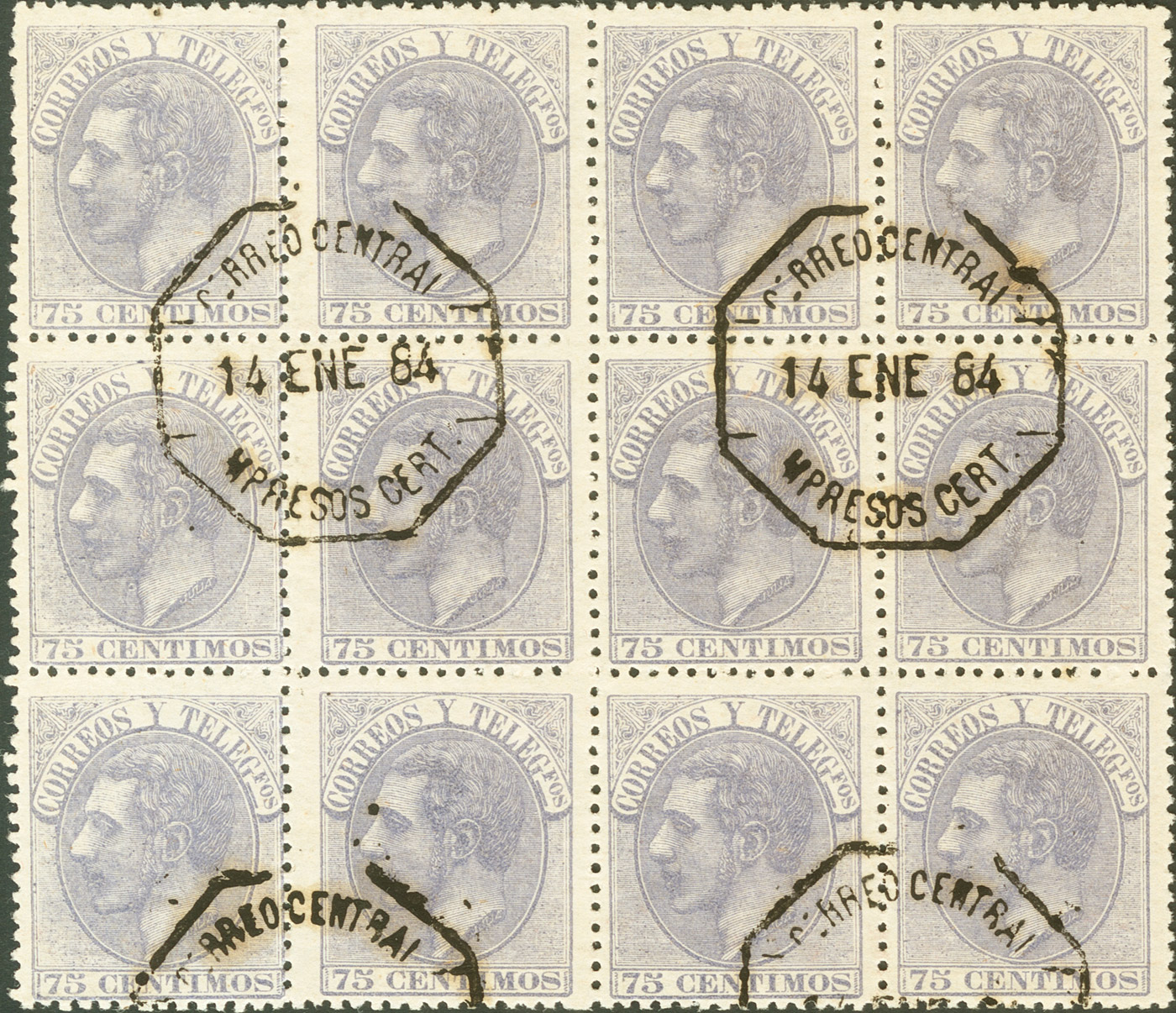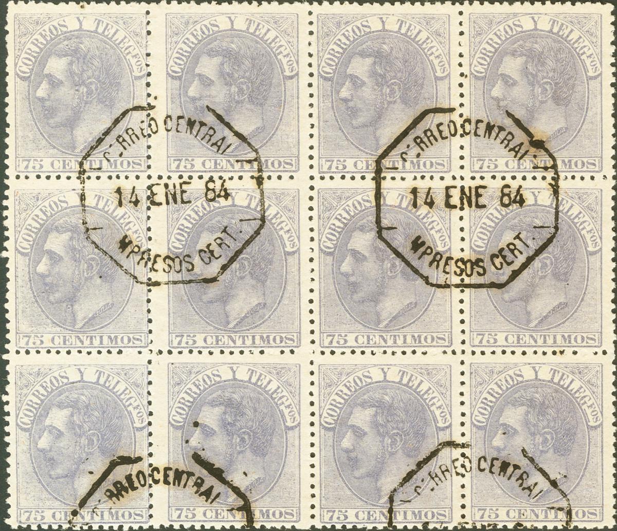 212(12). 1882. 75 cts violet-gray, block of twelve. CORREO CENTRAL / PRINTED CERT. MAGNIFICIENT.