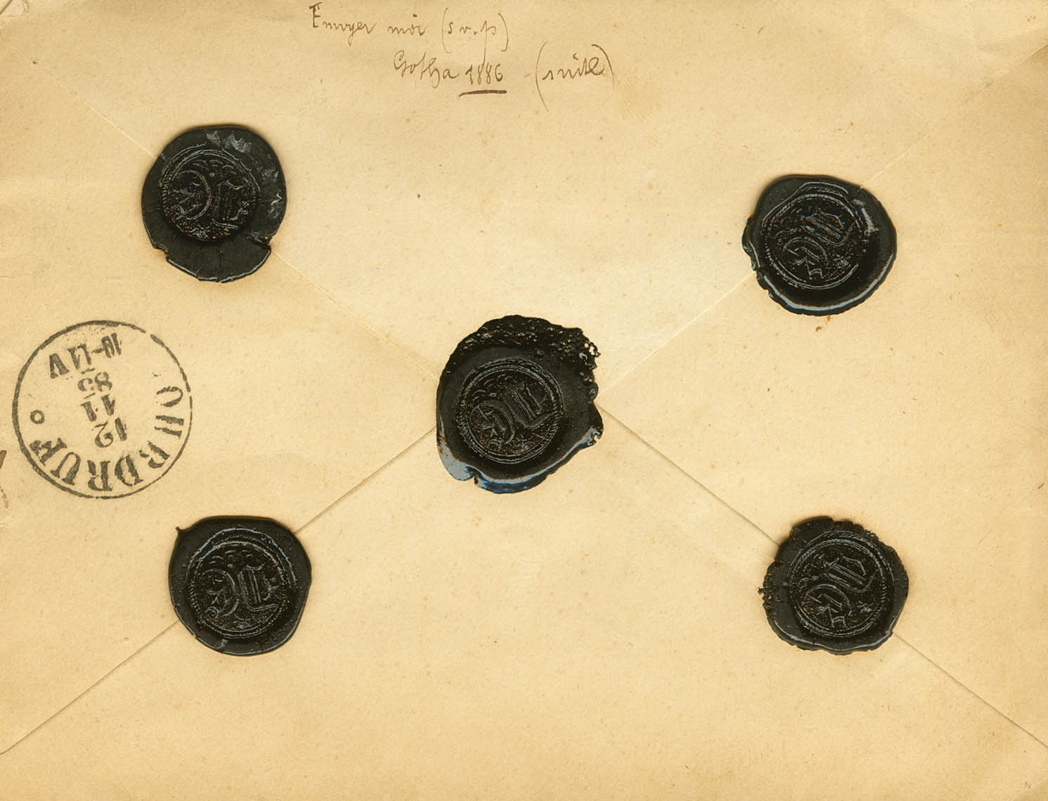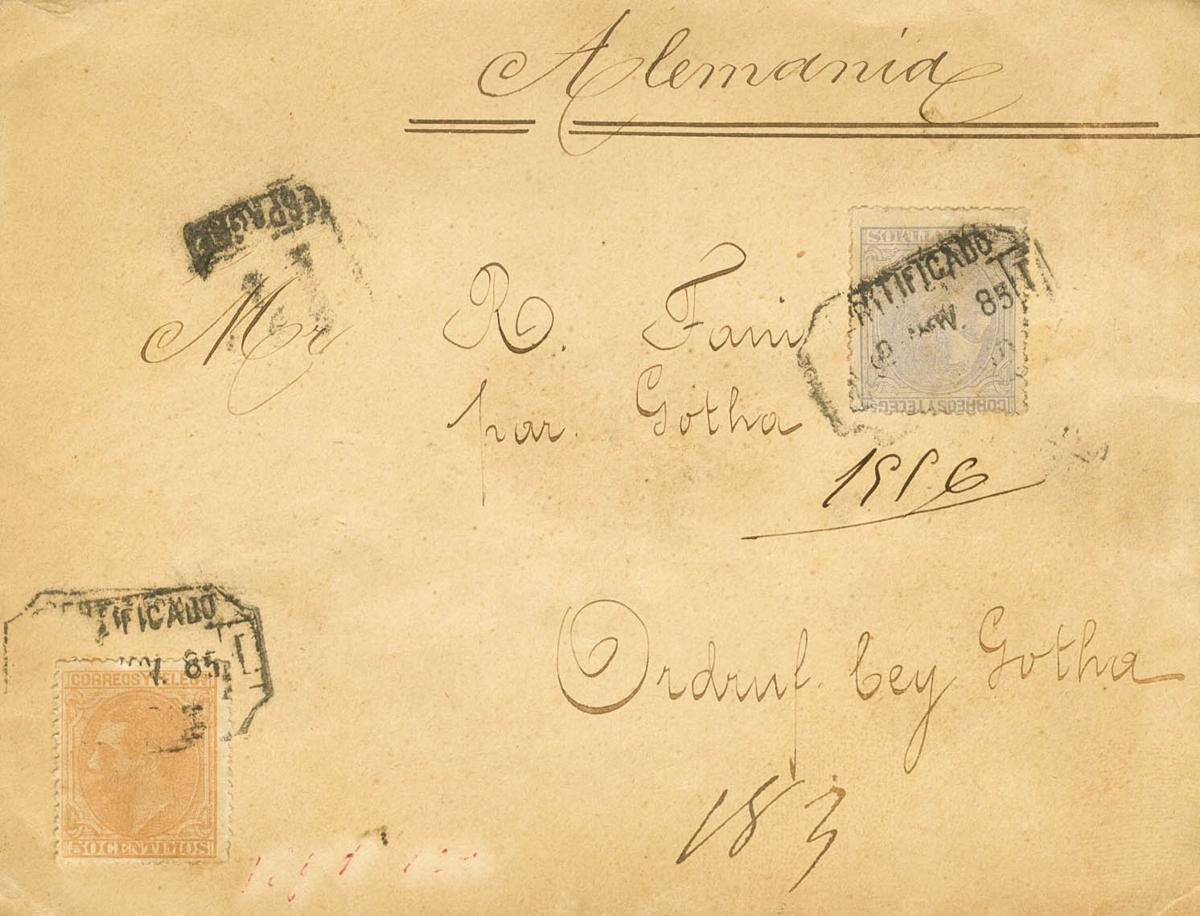 |ENVELOPE| 204, 206. 1885. 25 cts blue-grey and 50 cts orange. Certificate from MADRID to OHRDRUF (GERMANY). Arrival on the back. MAGNIFICENT AND RARE DOUBLE CERTIFIED POSTAGE.