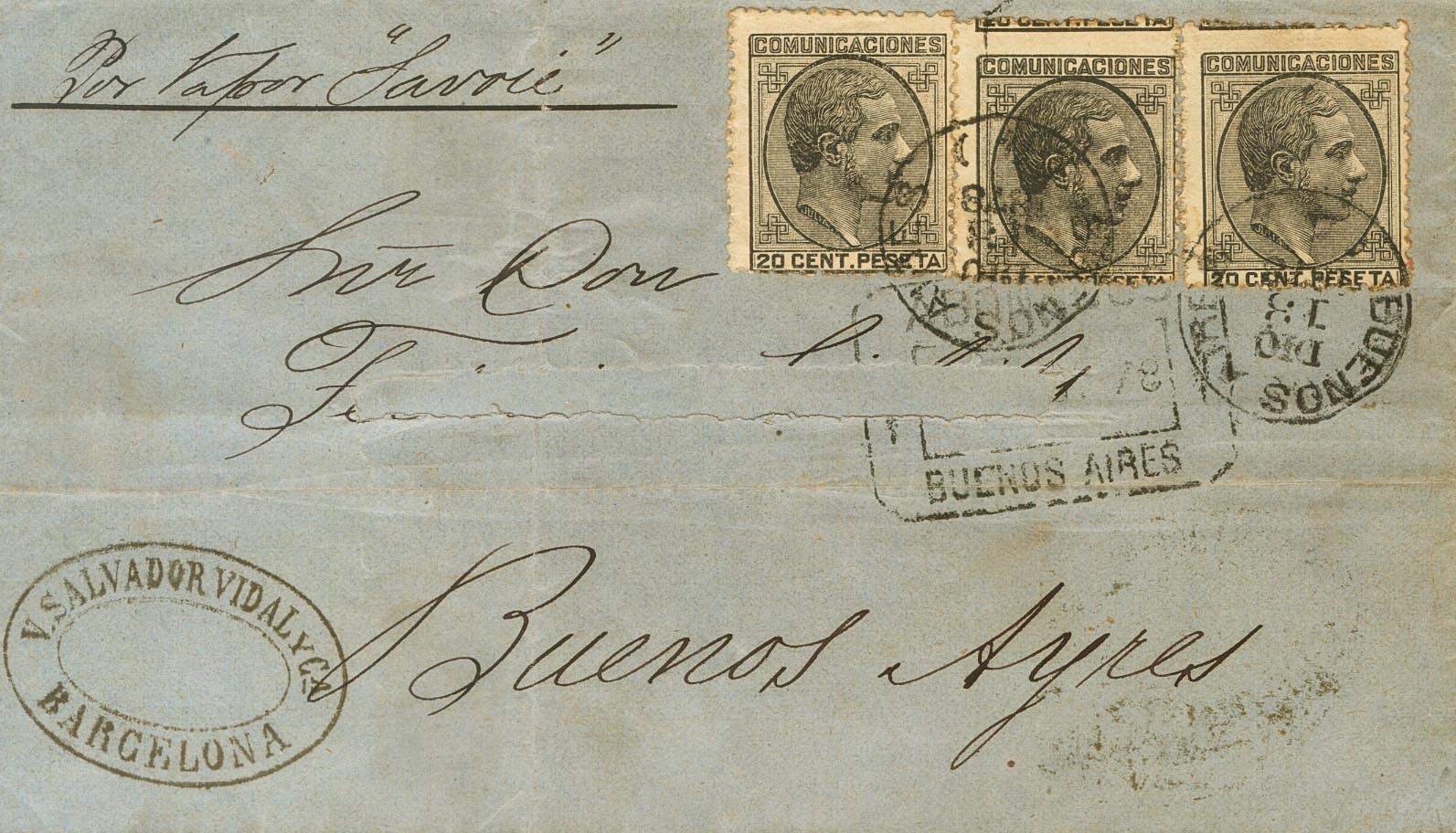|ENVELOPE| 193(3). 1878. 20 cts black, three stamps. BAGoodELONA to BUENOS AIRES (ARGENTINA) (address eroded), deposited directly on the ship "Savoie", of the Sociedad General de Transportes MarÃtimos, so the stamps are unusable at destination in Buenos Aires. NICE AND VERY RARE, ESPECIALLY WITH 5 CTS INSUFFICIENT POSTAGE.