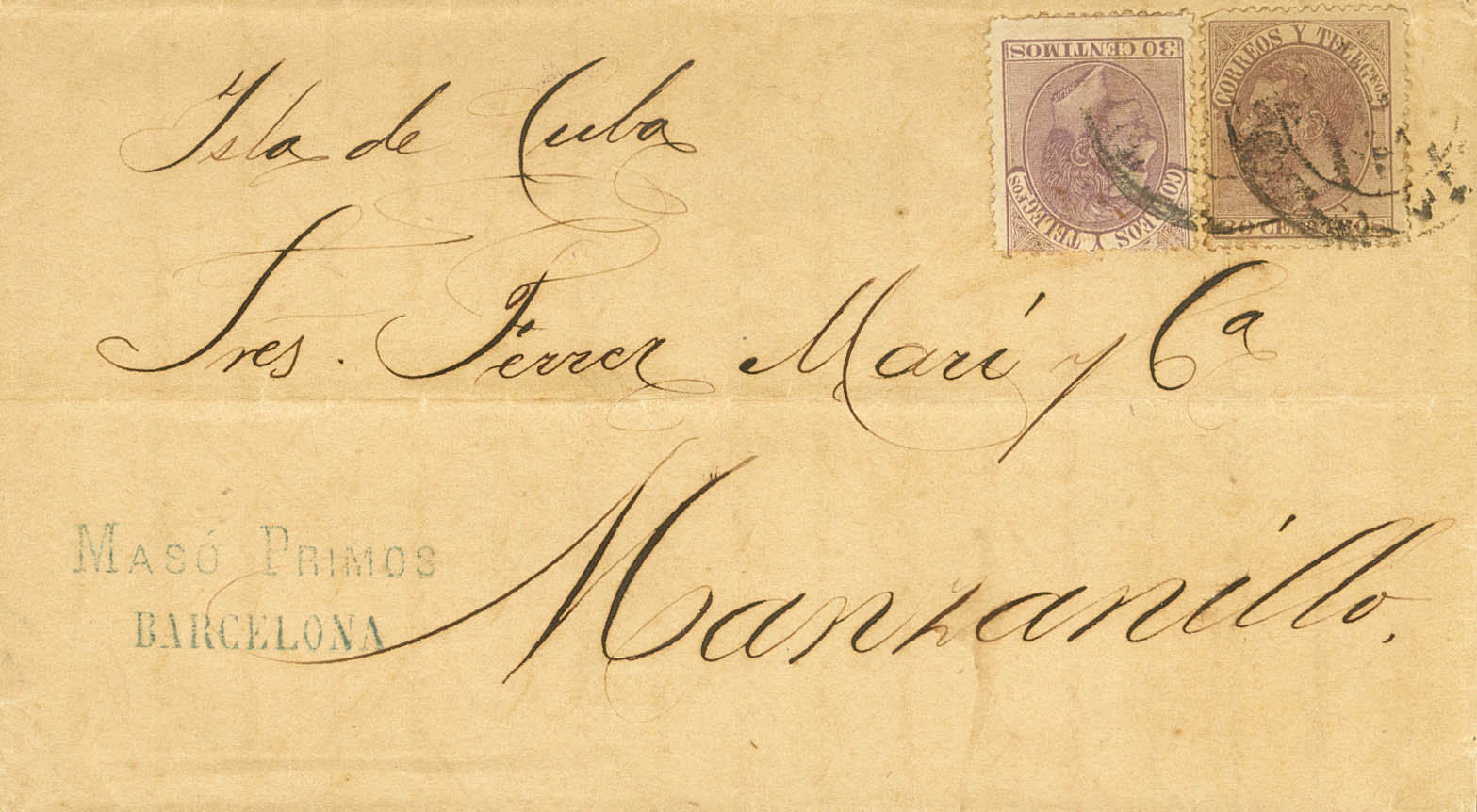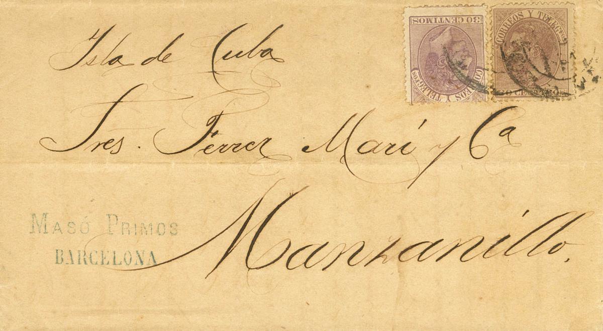 |ENVELOPE| 211(2). 1885. 30 cts lilac, two stamps. BAGoodELONA to MANZANILLO (CUBA). MAGNIFICENT AND UNUSUAL DOUBLE POSTAGE.