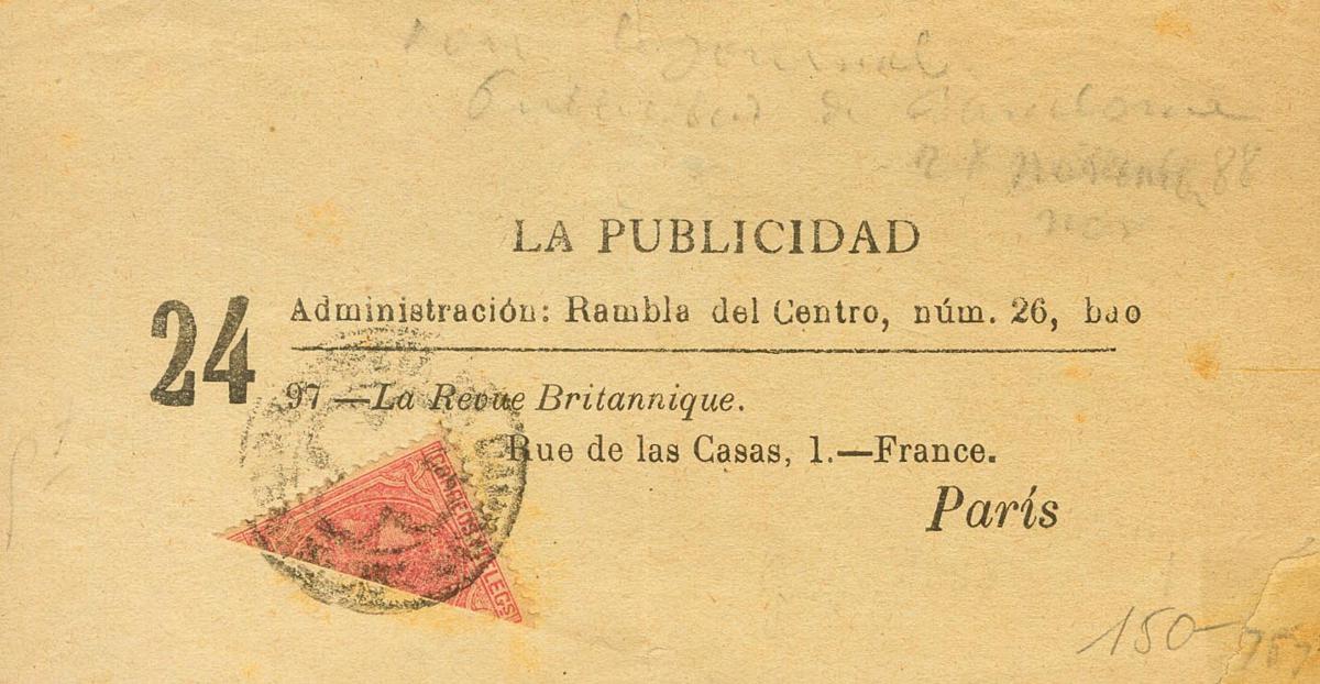 English |ENVELOPE| 202. (1879ca). 10 cts carmine rose BISECTED to serve as 5 cts. Front of Band of the Newspaper "La Publicidad" from BAGoodELONA to PARIS (FRANCE). Clover postmark ESTAFETA DE CAMBIO / BAGoodELONA, without date block. MAGNIFICENT AND RARE.