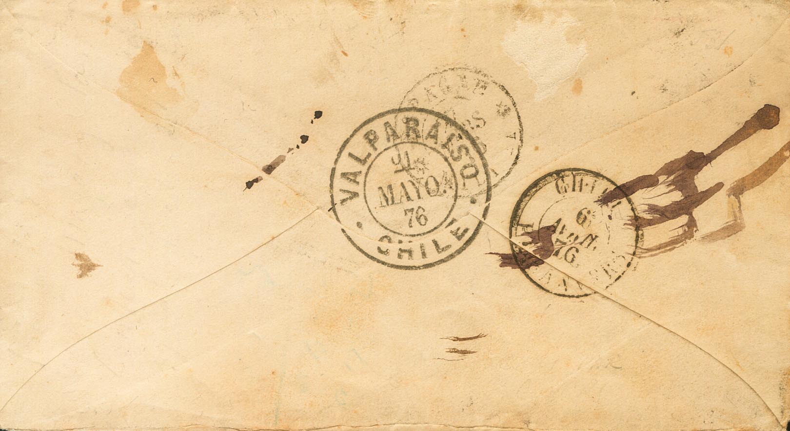 |COVER| 164(2), 170. 1876. 10 cts blue, two stamps and 1 pts black. BILBAO to SANTIAGO DE CHILE. On the front handwritten annotation "VÃa de Inglaterra" corrected to "Belgium" and mark VALPARAISO / 10 CTS / MULTADA, on the back date stamp CHILI / PAR ANVERS, applied to Belgian ships that were subcontracted by the German line Kosmos (the postage is correct for the route from England but with an excess of 20 cts for this Belgian steamship company). MAGNIFICENT AND VERY RARE, A PIECE OF ENORMOUS INTEREST.
