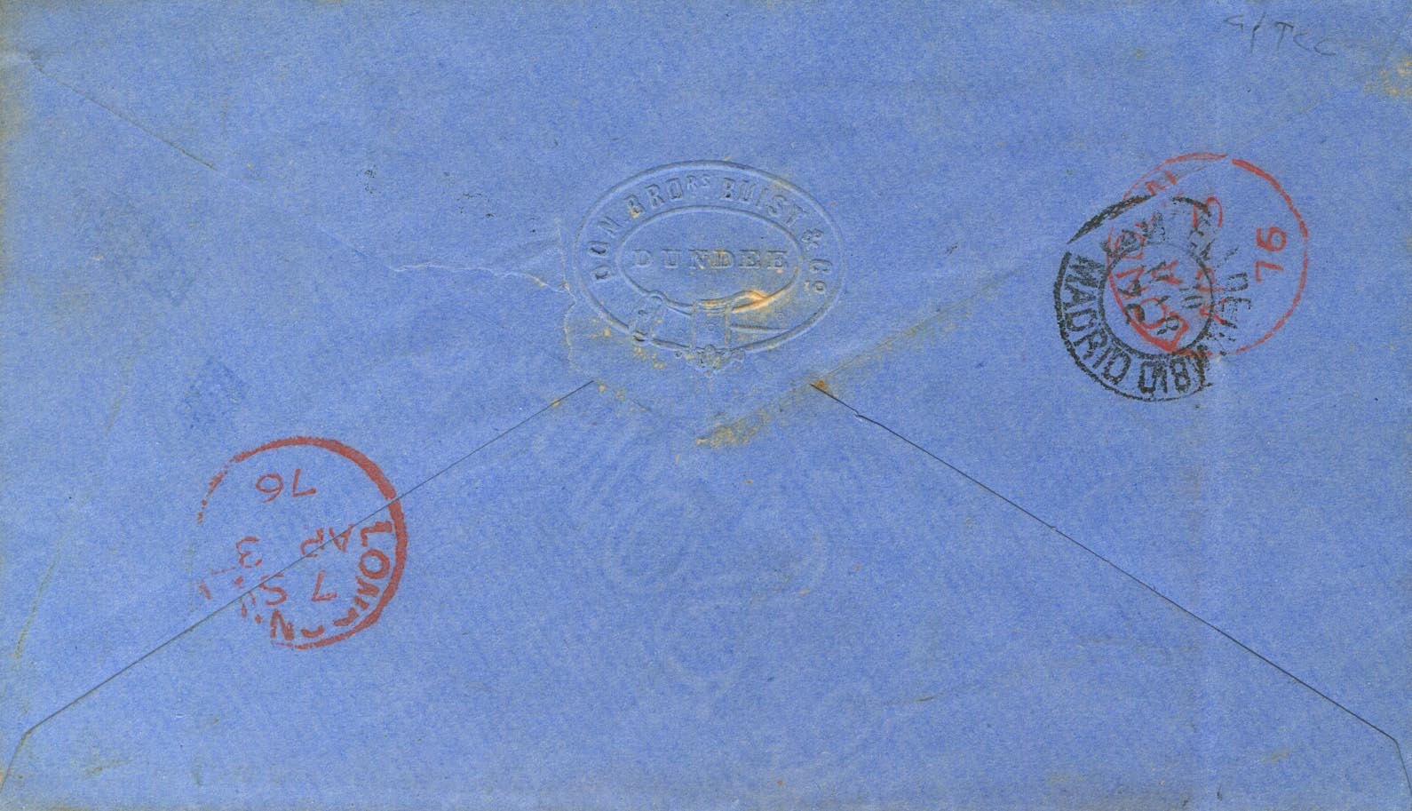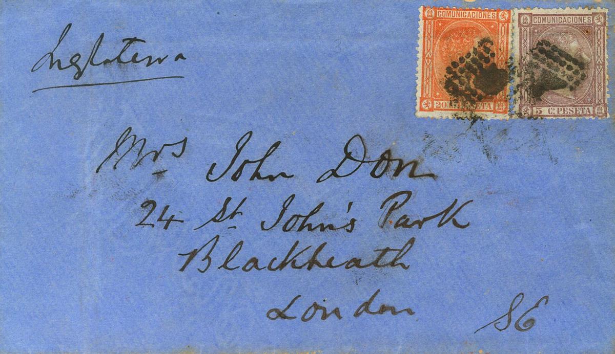 |ENVELOPE| 163, 165. 1876. 5 cts lilac and 20 cts orange. MADRID to LONDON (GREAT BRITAIN). MAGNIFICENT AND VERY RARE.