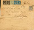 |ENVELOPE| 163, 164(2), 168, 169(2). 1876. 5 cts lilac, 10 cts blue, pair (one stamp defect), 50 cts lilac and 1 pts black, pair (one stamp defect). Certificate from SANTA CRUZ DE TENERIFE to MONTECOSARO (ITALY). Postage of nine shipments plus certificate fees. NICE AND SPECTACULAR POSTAGE. Cert. COMEX.