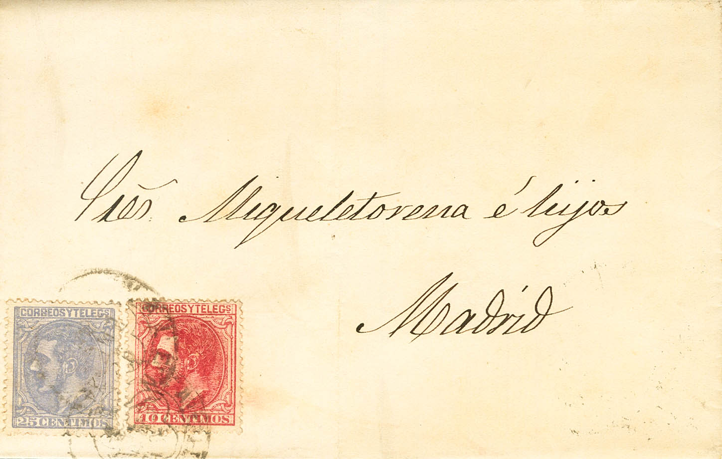 |ENVELOPE| 202, 204. 1880. 10 cts carmine and 25 cts blue-grey. BAGoodELONA to MADRID. MAGNIFICENT AND RARE POSTAGE OF 35 CTS TO COMPLETE THE DOUBLE POSTAGE RATE, ACCORDING TO THE RATE OF MAY 1879.