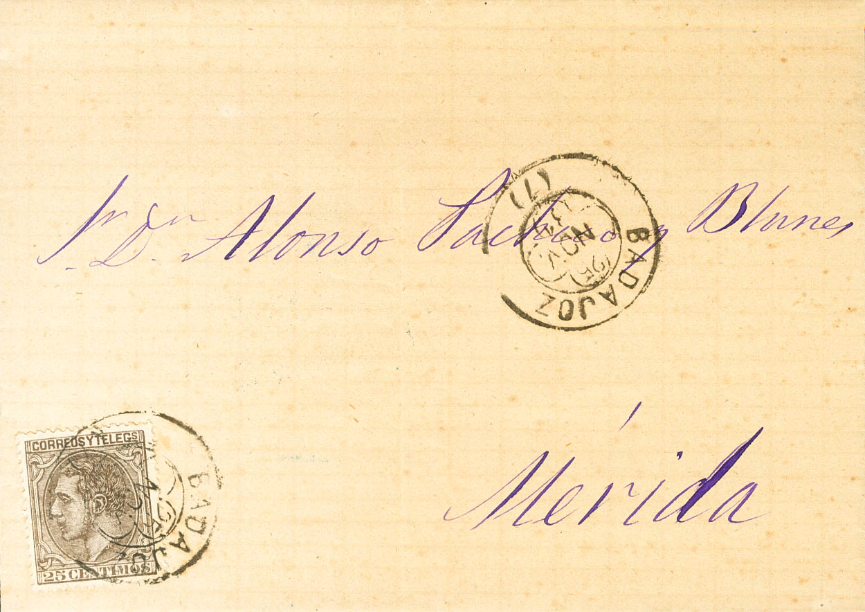 English |ABOUT| 204eca. 1881. 25 cts black-gray COLOR ERROR. BADAJOZ to MERIDA. Clover postmark BADAJOZ / (7). MAGNIFICENT AND SPECTACULAR PIECE, WHICH IN OUR OPINION IS DUE TO A COLOR TONE, IN CONTRAST TO THE OPINION OF THE EDIFIL CATALOGUE WHICH CONSIDERS IT A COLOR ERROR, AS WE HAVE DEUncirculatedRIBED IT FOR BETTER UNDERSTANDING.