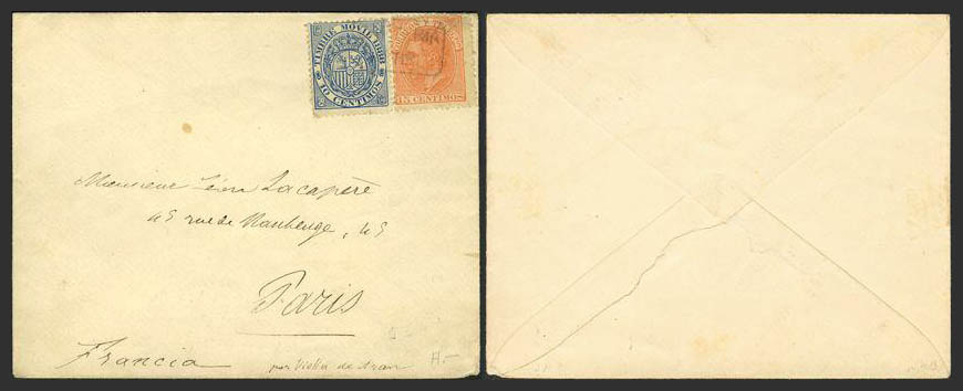 210, mobile. (1882ca). 15 cts orange and 10 cts blue, mobile bell. Addressed to PARIS. By Viella de Aran. MAGNIFICENT AND RARE.