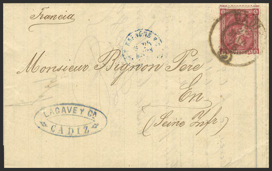 English 166. 1876. 25 cts rose. CADIZ to FRANCE. Postmark CADIZ / (3). MAGNIFICENT.