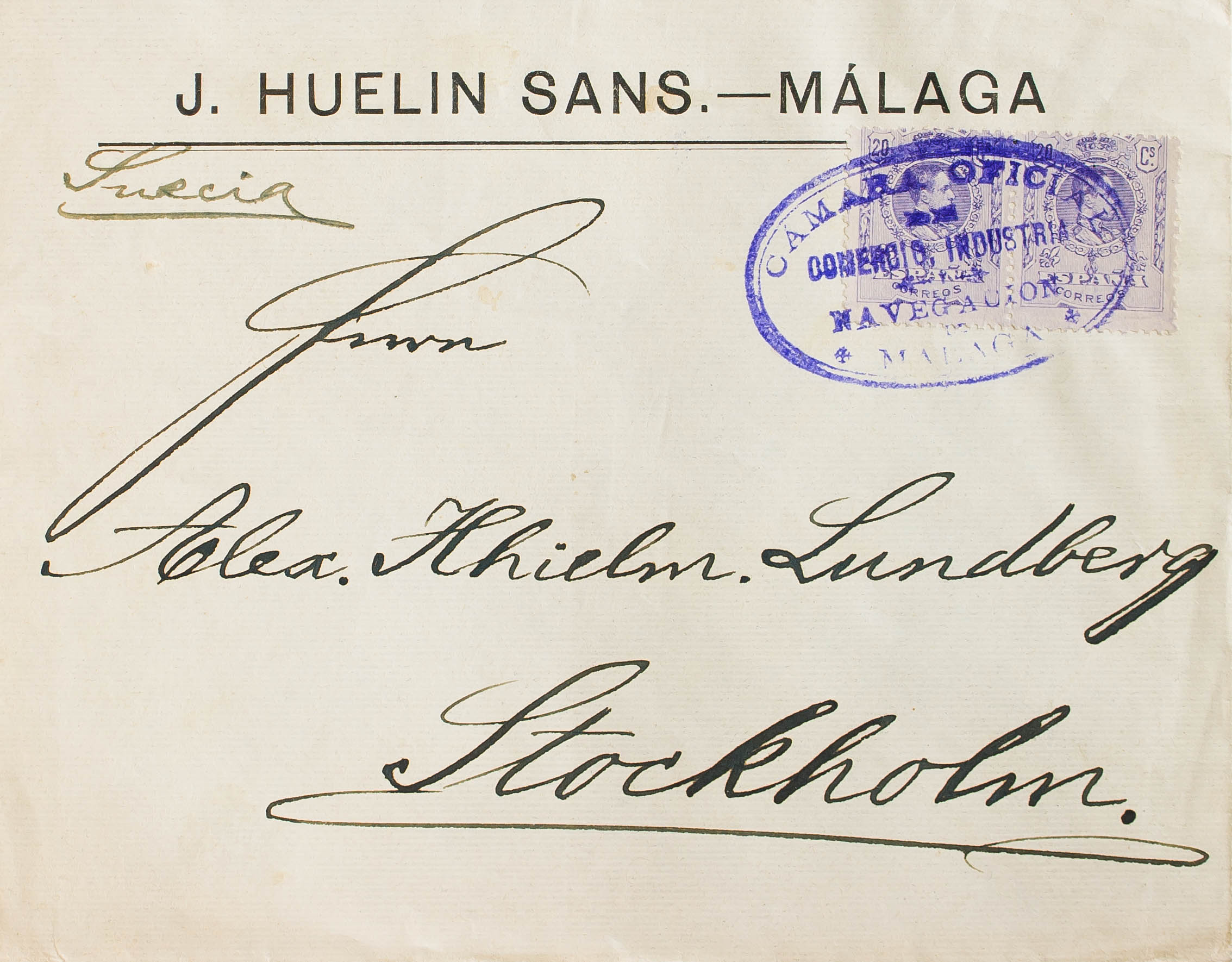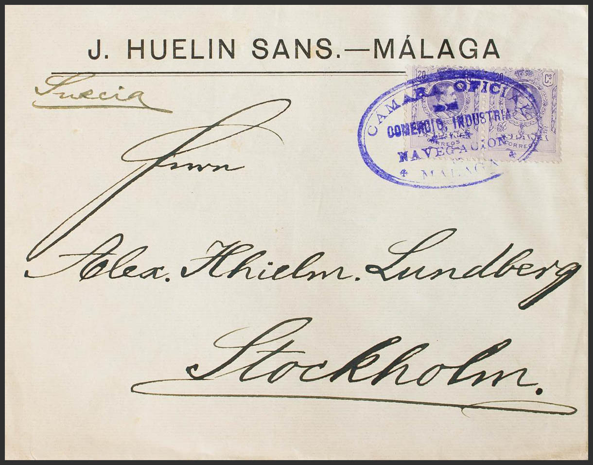 273(2). (1922ca). 20 violet cts, two stamps. MALAGA to STOCKHOLM (SWEDEN). Postmark OFFICIAL CHAMBER / OF COMMERCE, INDUSTRY AND NAVIGATION / MALAGA, in violet, circulated during the period of the postal strike of 1922. MAGNIFICENT AND RARE.