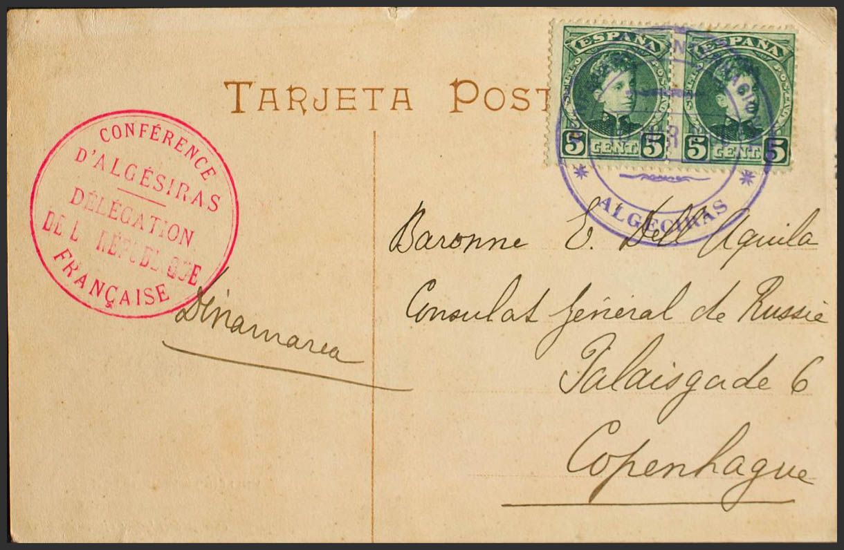 English 242(2). 1906. 5 green cts, two stamps. Postcard from ALGECIRAS to COPENHAGEN (DENMARK). Postmark INTERNATIONAL CONFERENCE / *ALGECIRAS*, in violet. MAGNIFICENT AND SPECTACULAR.
