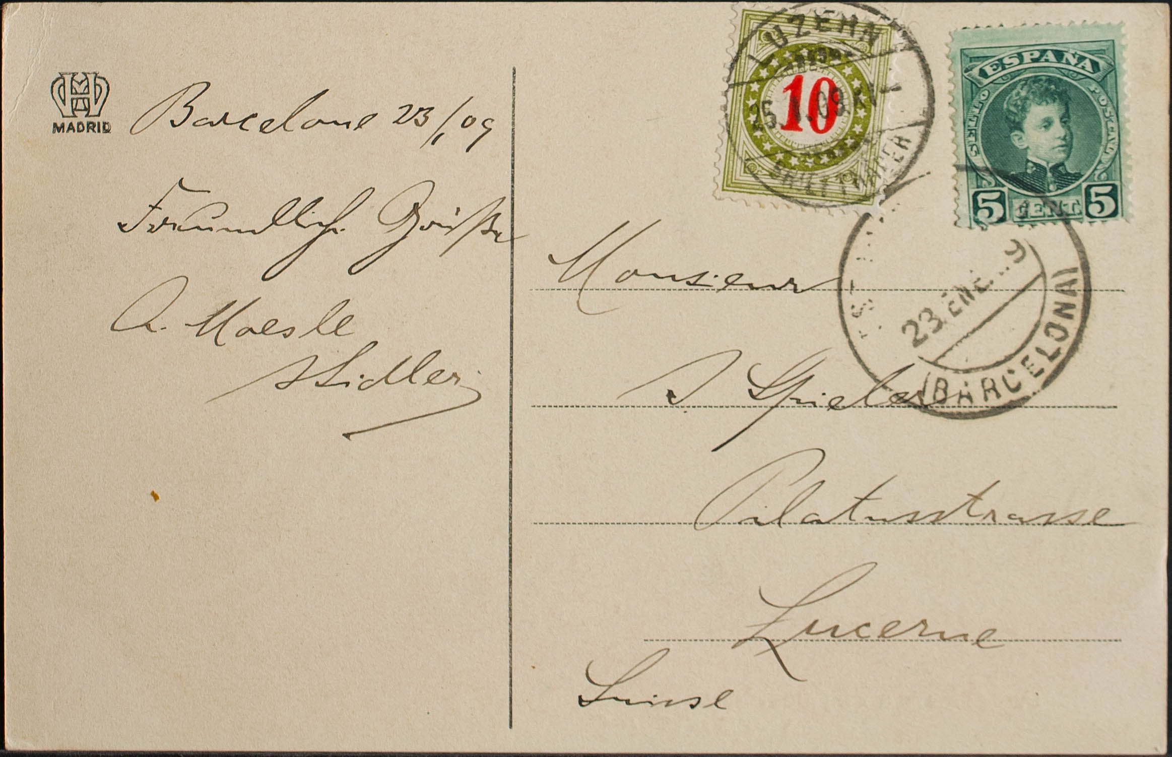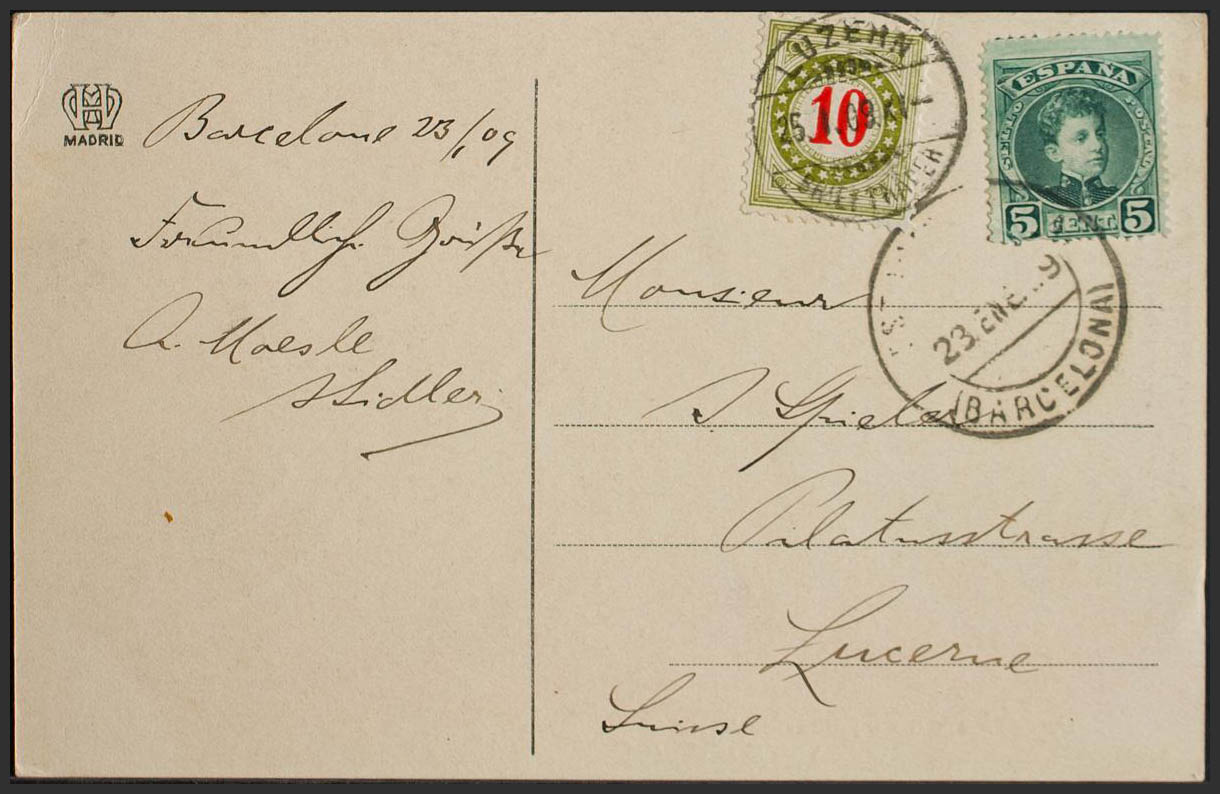 English 242. 1909. 5 cts green. Postcard from BARCELONA to LUCERNA (SWITZERLAND). Taxed on arrival applying Swiss tax stamp of "10 rp". MAGNIFICENT.