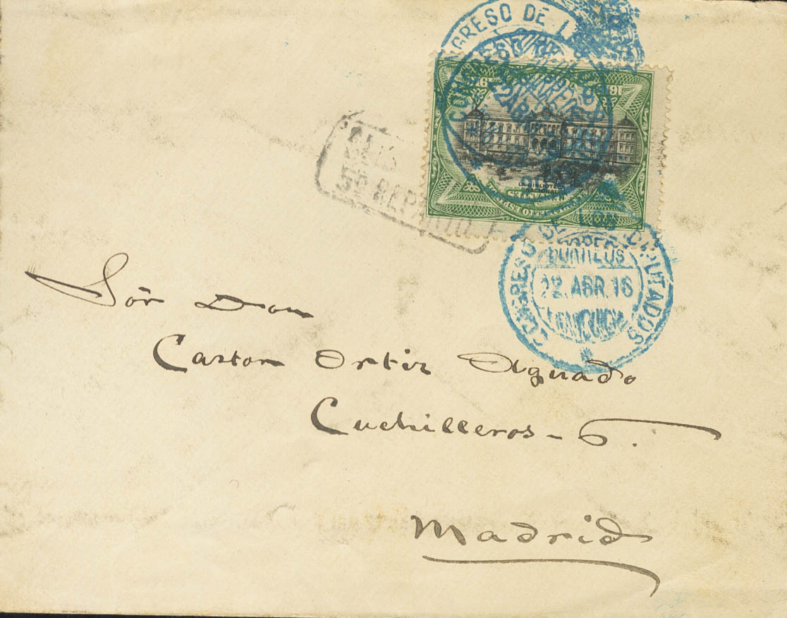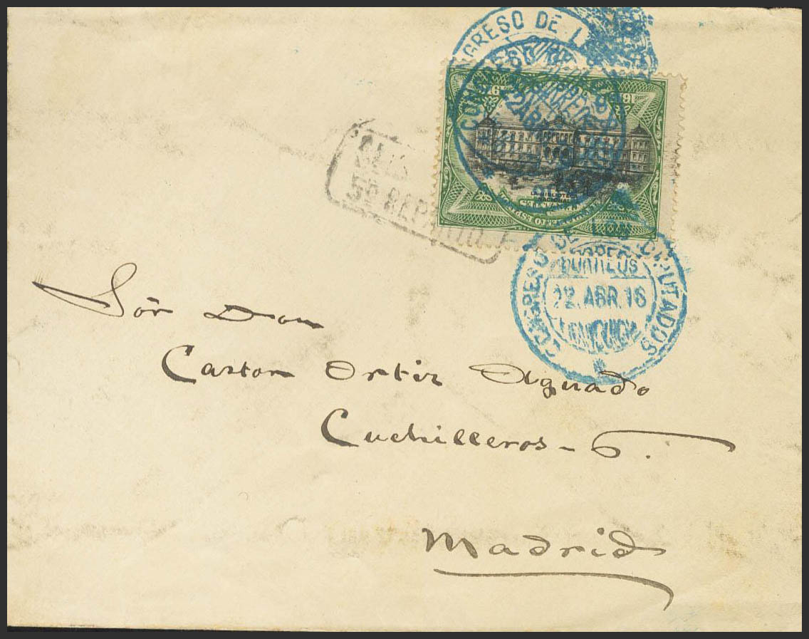 FR11ei. 1916. Worthless INVERTED CENTER, green and black. MADRID Interior Mail. CONGRESS OF DEPUTIES postmark, in blue and arrival on the back. MAGNIFICENT AND VERY RARE WITH THIS TRULY CIRCULATED VARIETY.