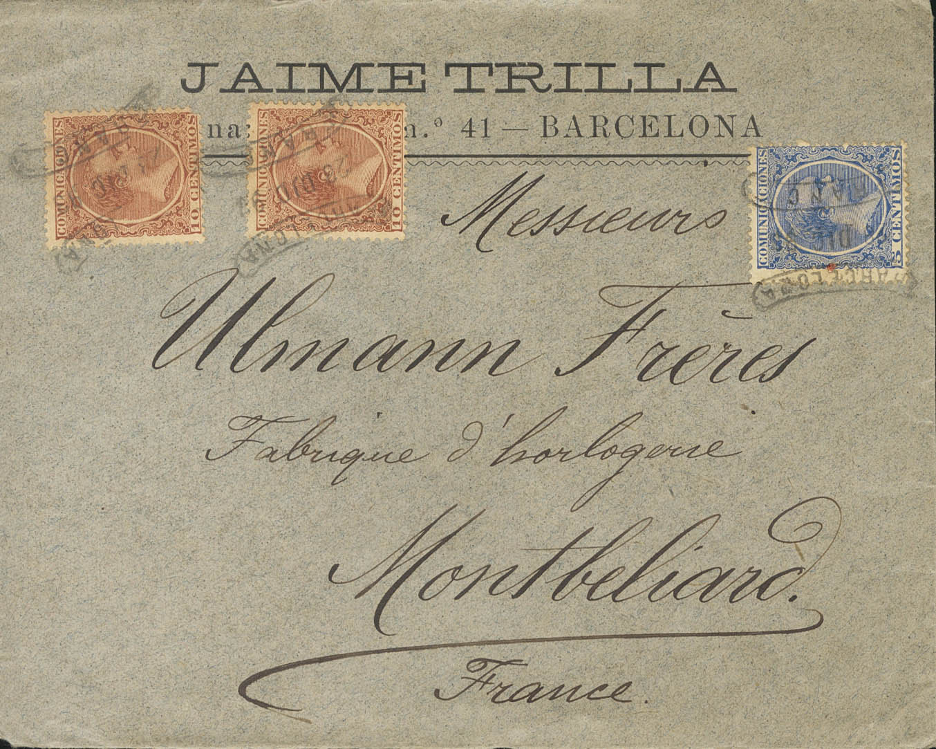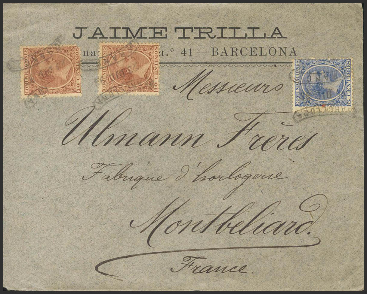 215, 217(2). 1897. 5 cts blue and 10 cts yellow chestnut, two stamps. BARCELONA to MONTBELLIARD (FRANCE). Special BARCELONA / FRANCO postmark and arrival on the back. MAGNIFICENT AND RARE, TRULY SPECTACULAR.
