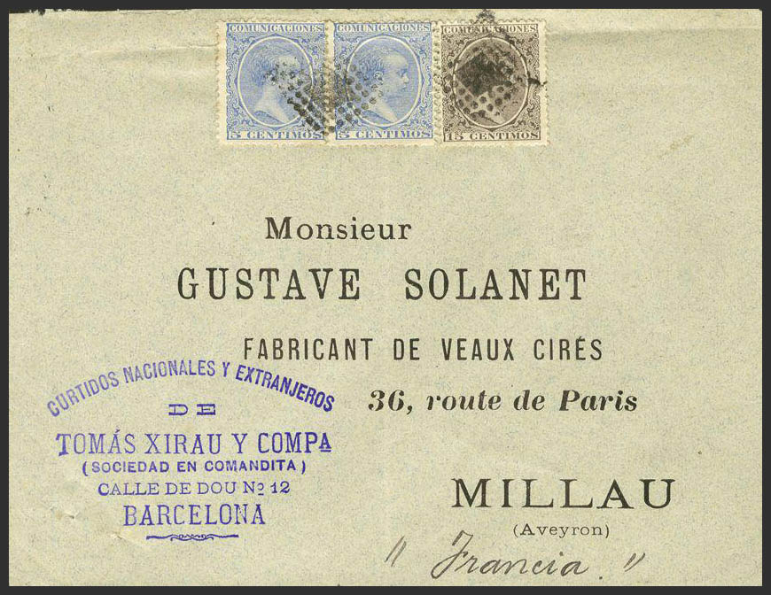 215(2), 219. 1890. 5 cts blue, two stamps and 15 cts chestnut. BARCELONA to MILLAU (FRANCE). DOTTED RHOMBUS postmark. VERY LATE USE AND UNUSUAL COMBINATION.