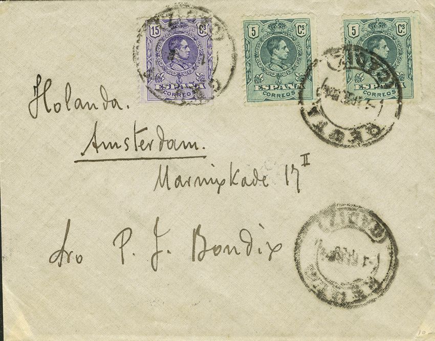 268(2), 270. 1914. 5 cts., two stamps and 15 cts. CEUTA to AMSTERDAM (HOLLAND). Postmark CEUTA / (CADIZ), arrival on the back. MAGNIFICENT and RARE.