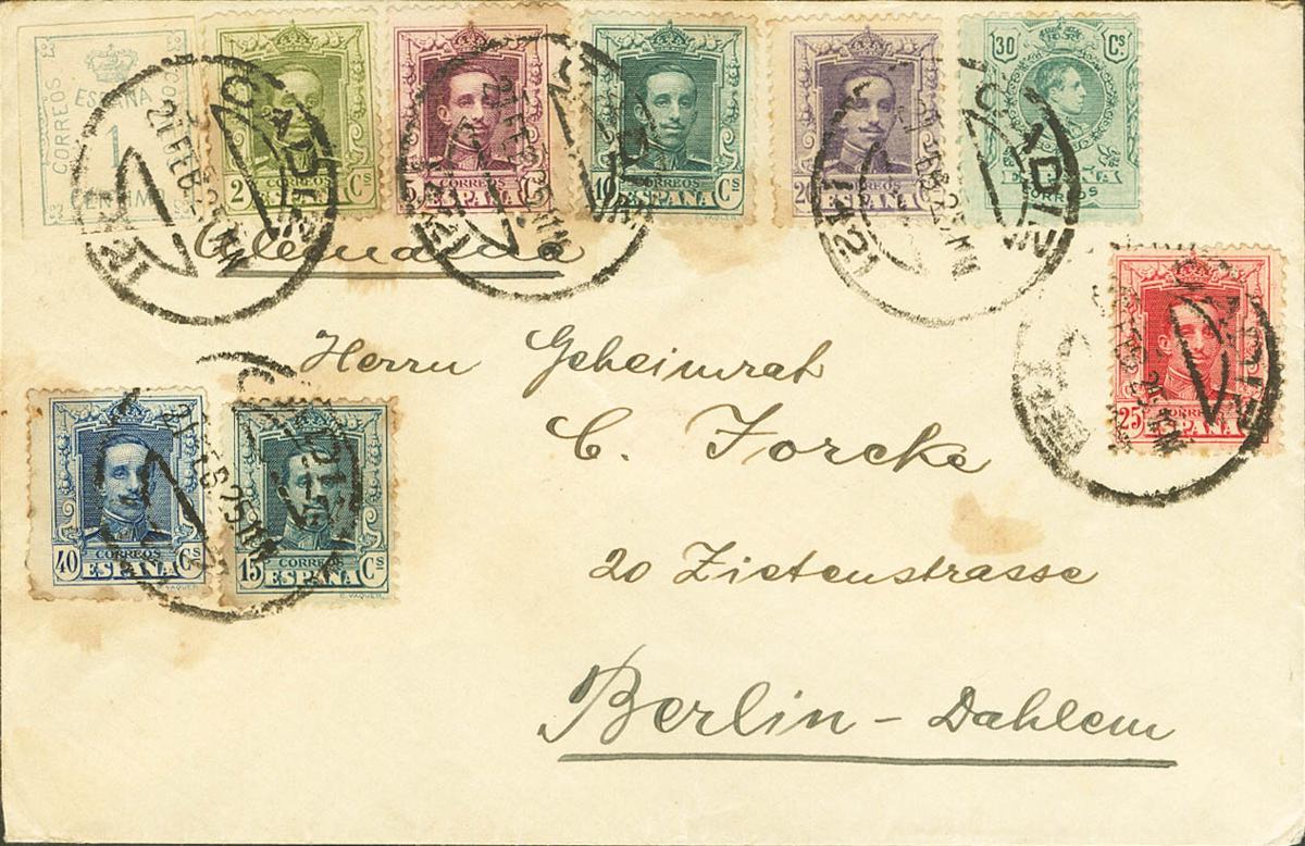 |ENVELOPE| 310, 311, 314/15, 316, 319. 1925. Various Vaquer values, 1 cts green and 30 cts green (Medallion). Envelope from Hugo Stinnes Linien (letterhead on the back) from CADIZ to BERLIN. NICE AND UNUSUAL POSTAGE OF DIFFERENT ISSUES.