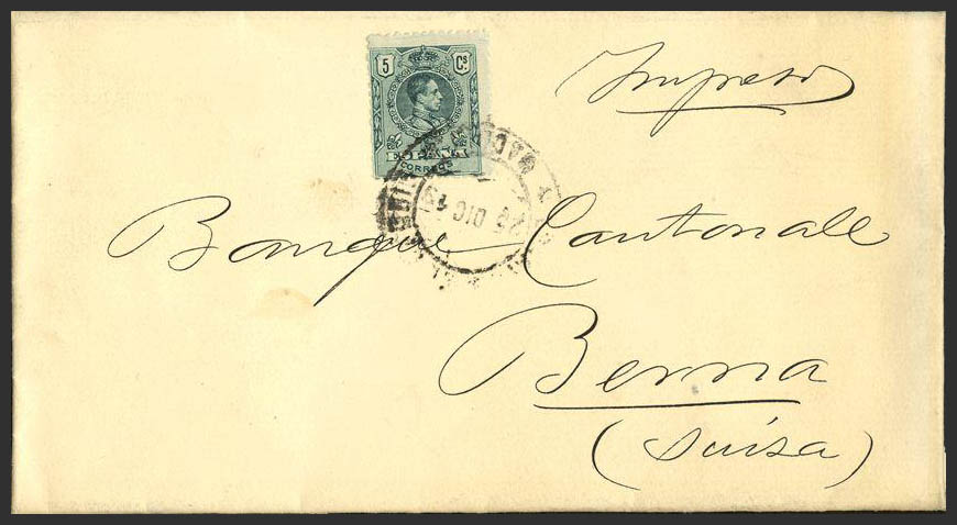 268. 1919. 5 cts green. MADRID to SWITZERLAND. BEAUTIFUL AND UNUSUAL PRINT RATE.