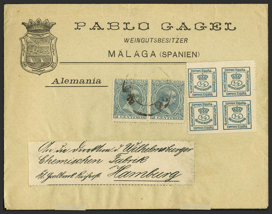 English 176, 213(2). (1889ca). 4/4 cts green, private vertical serration and 2 cts, pair. MALAGA to GERMANY. MAGNIFICENT.