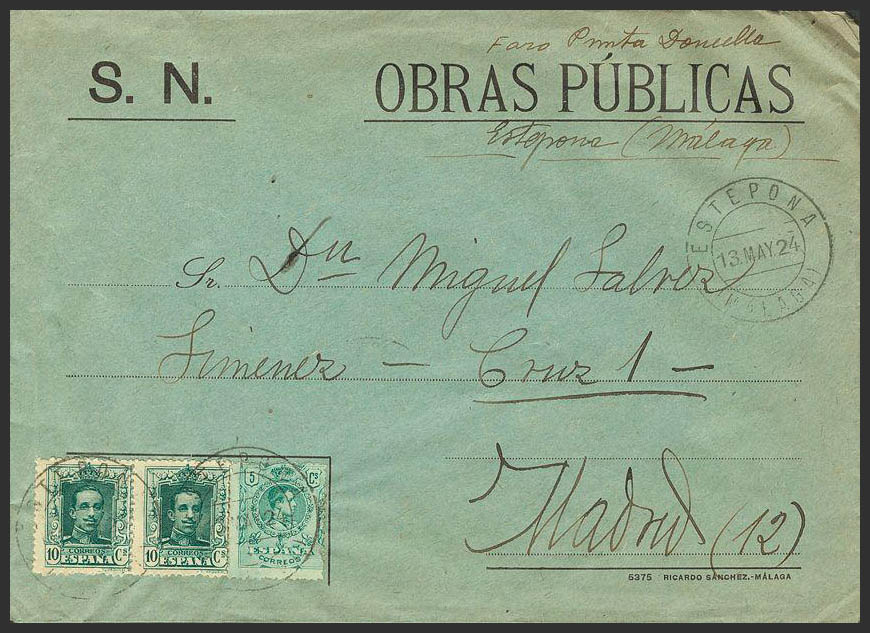314(2), 268. 1924. 5 cts and 10 cts, pair. ESTEPONA to MADRID. On the back arrival. MAGNIFICENT AND UNUSUAL POSTAGE OF TWO ISSUES.