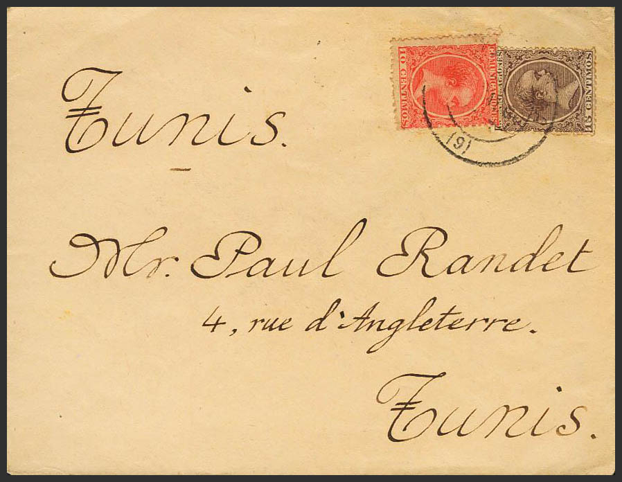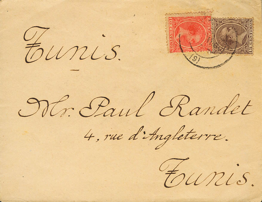 English 218, 219. 1900. 10 cts vermilion and 15 cts chestnut. BARCELONA to TUNISIA. On the back arrival. MAGNIFICENT AND RARE DESTINATION.