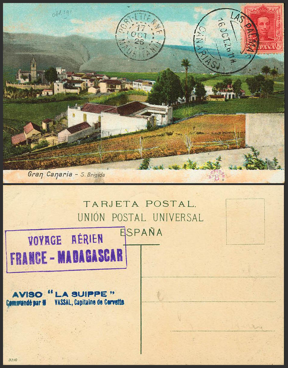 317. 1926. 25 cts carmine. Postcard from Gran Canaria of the FRANCE-MADAGASCAR air raid, in the LAS PALMAS-PORT ETIENNE stage. Flight mark VOYAGE AERIEN / FRANCE-MADAGASCAR, in purple and linear NOTICE "LA SUIPPE" / COMMANDE PAR M VASSAL, CAPITAINE DE CORVETTE, in blue, of the ship that supported the Raid aircraft. MAGNIFICENT AND EXTREMELY RARE, NO MORE THAN TWO OR THREE CARDS KNOWN WITH THE MARK OF THE SHIP "LA SUIPPE".