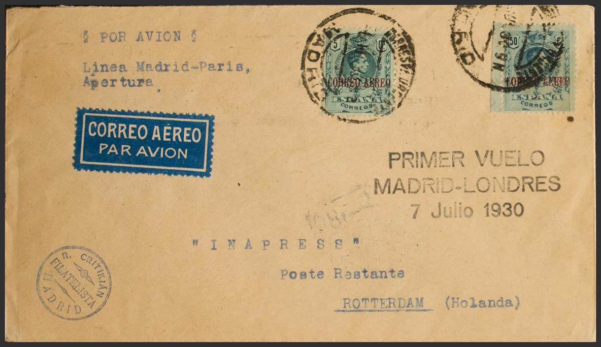English 292, 295. 1930. 5 cts green and 50 cts greenish blue. Air Mail from MADRID to ROTTERDAM (HOLLAND). On the front it marks FIRST FLIGHT / MADRID-LONDRES / 7-JULIO-1930, on the back transit and arrival. MAGNIFICENT AND RARE.