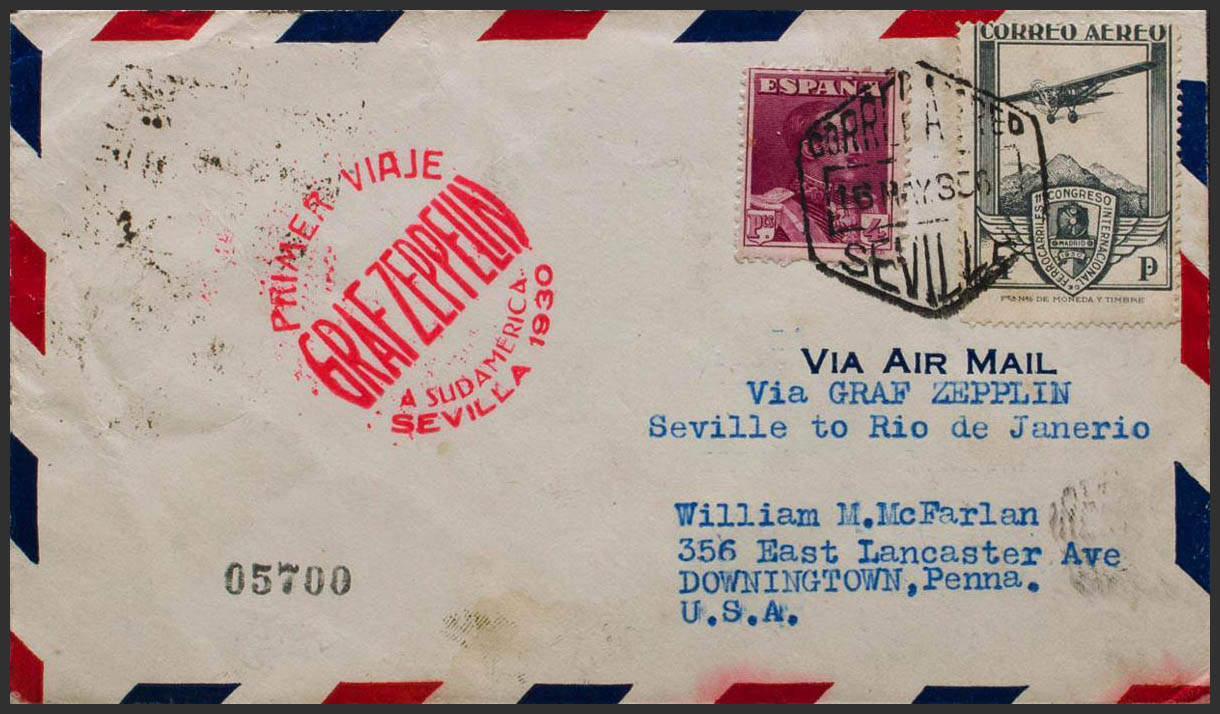 488, 432. 1930. 4 sts lilac and 4 sts grey. Graf Zeppelin from SEVILLE to DOWNINGTOWN (USA), via Rio de Janeiro. Flight and arrival marks. MAGNIFICENT.