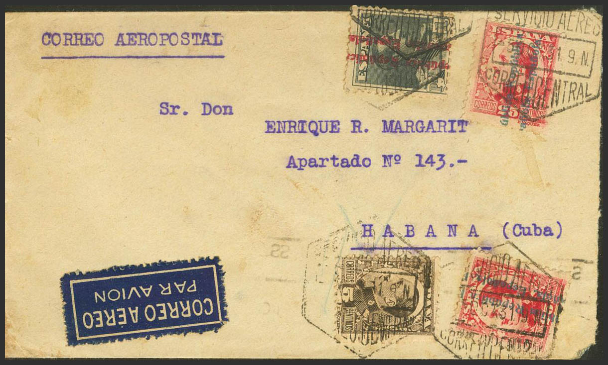 594, 598(2), 602. 1931. 5 cts chestnut, 25 cts carmine, two stamps and 1 pts slate. Airmail from MADRID to HAVANA (CUBA). Postmark AIR SERVICE / CENTRAL MAIL. MAGNIFICENT.