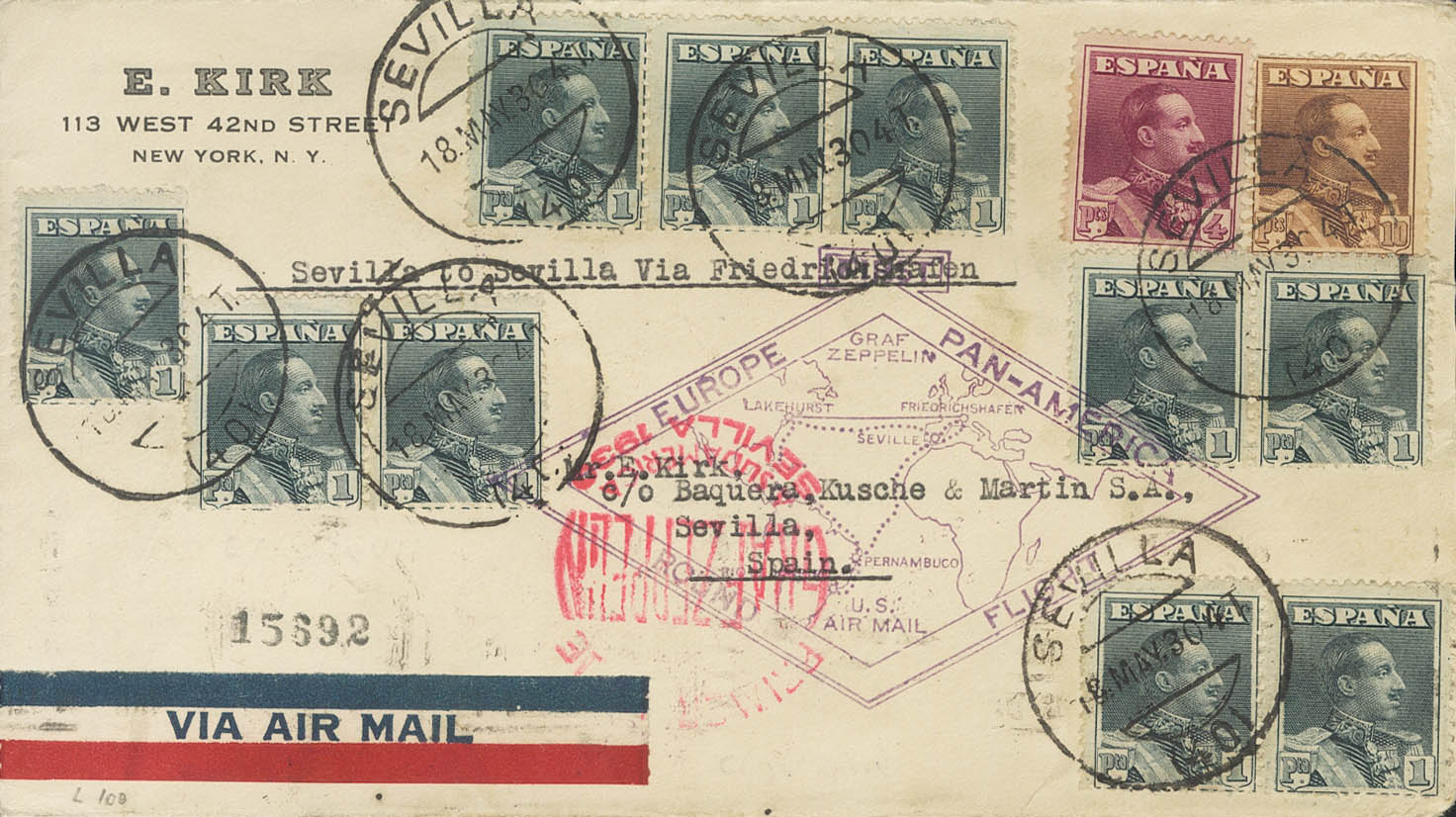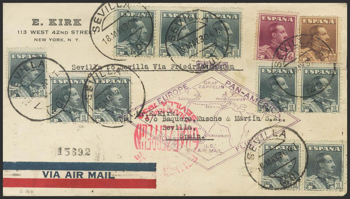 English 321(11), 322, 323. 1930. 1 pts slate, eleven stamps, 4 pts violet carmine and 10 pts chestnut. Graf Zeppelin circular flight from SEVILLE to SEVILLE. On the front marks PRIMER VIAJE / GRAF ZEPPELIN / A SUDAMERICA / SEVILLA 1930, in carmine and EUROPE PAN-AMERICA / ROUND FLIGHT, in violet and on the back marks of the Router Agent of the Zeppelin BAQUERA, KUSCHE AND MARTIN SA, in violet, transit through New York, in green and arrival. MAGNIFICENT AND VERY RARE WITH THE AGENT'S BRAND ON THE BACK.