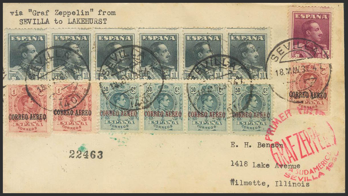321(6), 322, 295(14), 296(3). 1930. 1 pts slate, strip of six, 4 pts violet carmine, 50 cts blue green, fourteen stamps (ten on the back) and 1 pts carmine, three stamps. Graf Zeppelin from SEVILLE to WILMETTE (USA). Marks FIRST FLIGHT / GRAF ZEPPELIN / TO SOUTH AMERICA / SEVILLE 1930, in red and on the back marks arrival to LAKEHURST, in green. MAGNIFICENT AND RARE.