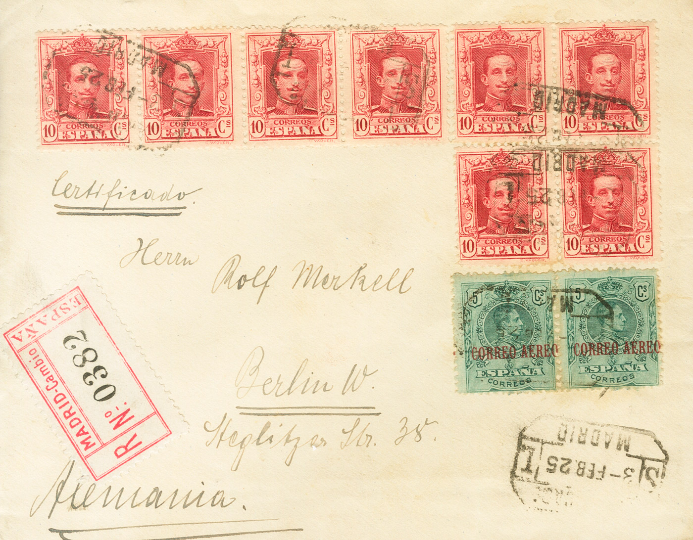 English |ENVELOPE| 313(8), 292(2). 1925. 10 cts carmine, eight stamps and 5 cts green. Certificate from MADRID to BERLIN (GERMANY). Arrival on the back. MAGNIFICENT.