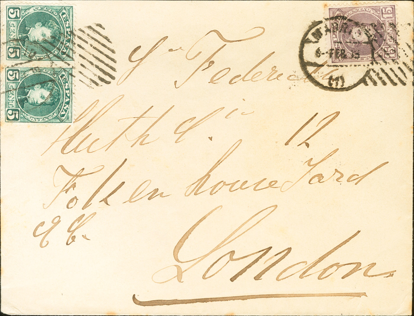 |ENVELOPE| 242(2), 245. 1903. 5 cts green, two stamps and 15 cts lilac chestnut. MADRID to LONDON (GREAT BRITAIN). Postmark (roller test) MADRID / (1), arrival on the back. MAGNIFICENT.
