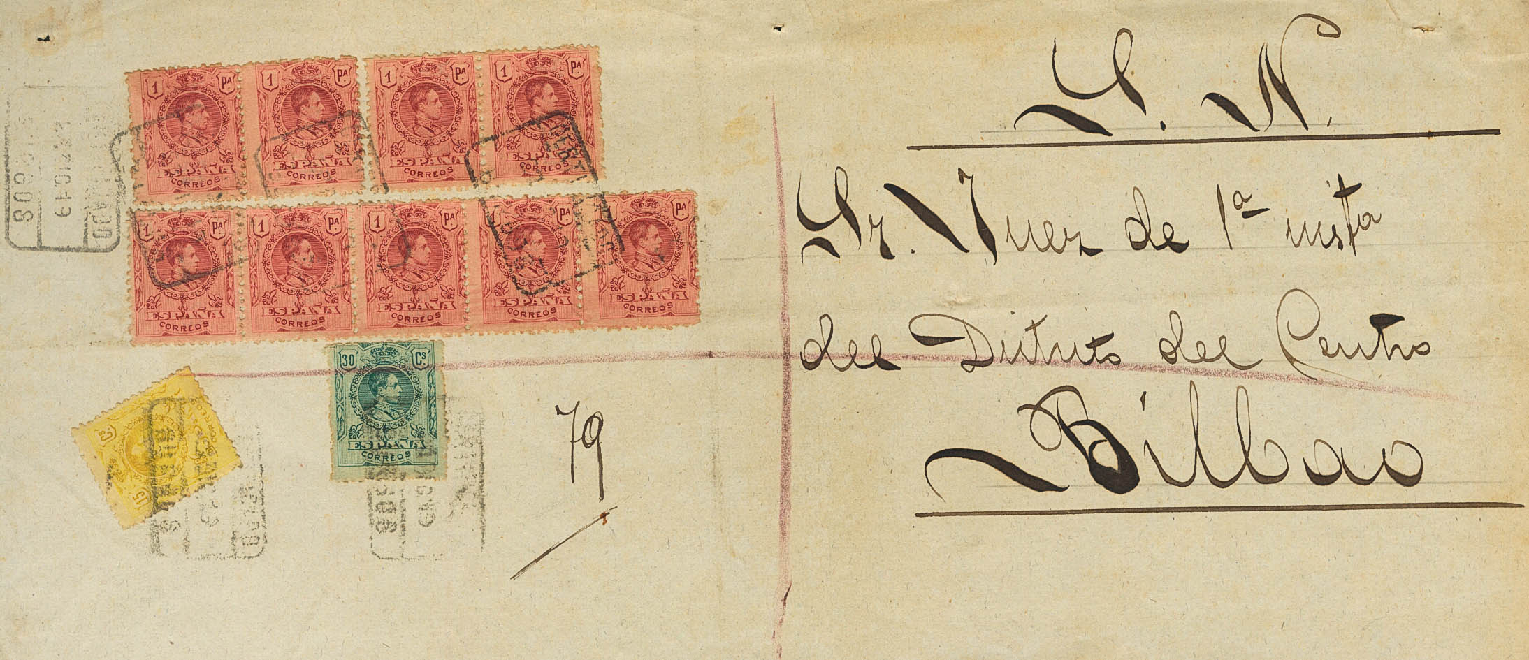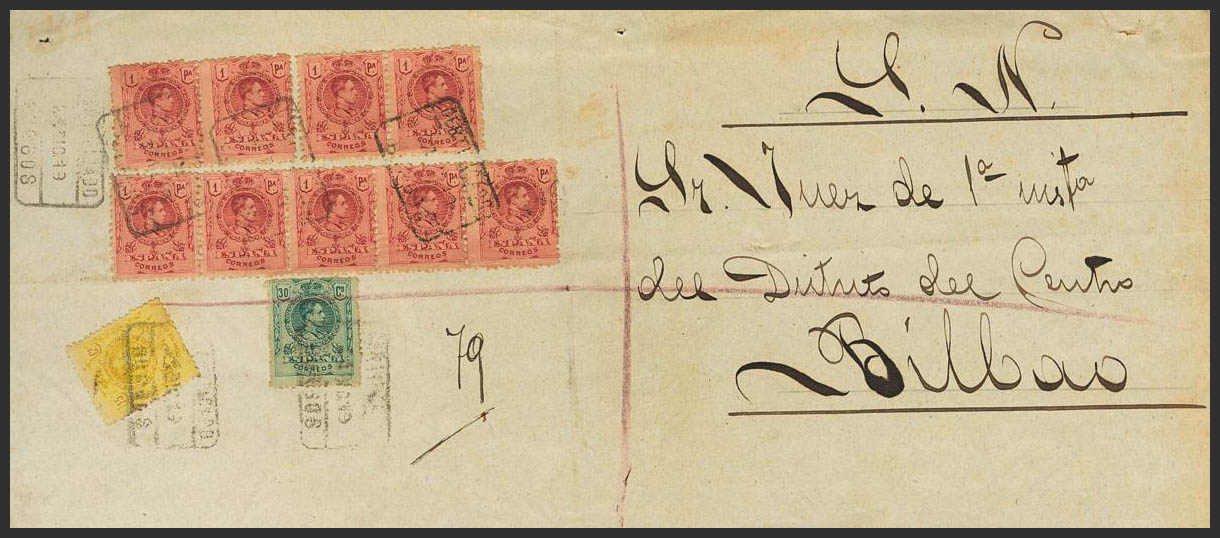 278(9), 271, 275. 1919. 1 carmine pts, nine stamps, 15 cts yellow and 30 cts green. Front of Certified Judidical Escrow from BURGOS to BILBAO. MAGNIFICENT AND RARE POSTAGE.