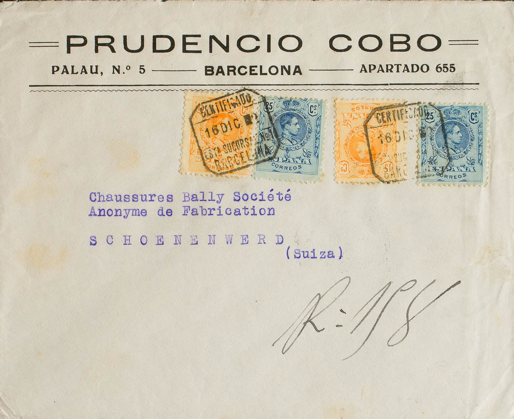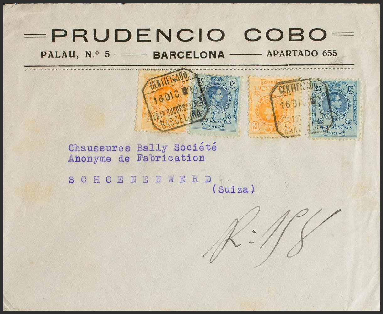 271(2), 274(2). 1922. 15 cts yellow, two stamps and 25 cts blue, two stamps. Certificate from BARCELONA to SCHOENENWERD (SWITZERLAND). On the back arrival. MAGNIFICENT.