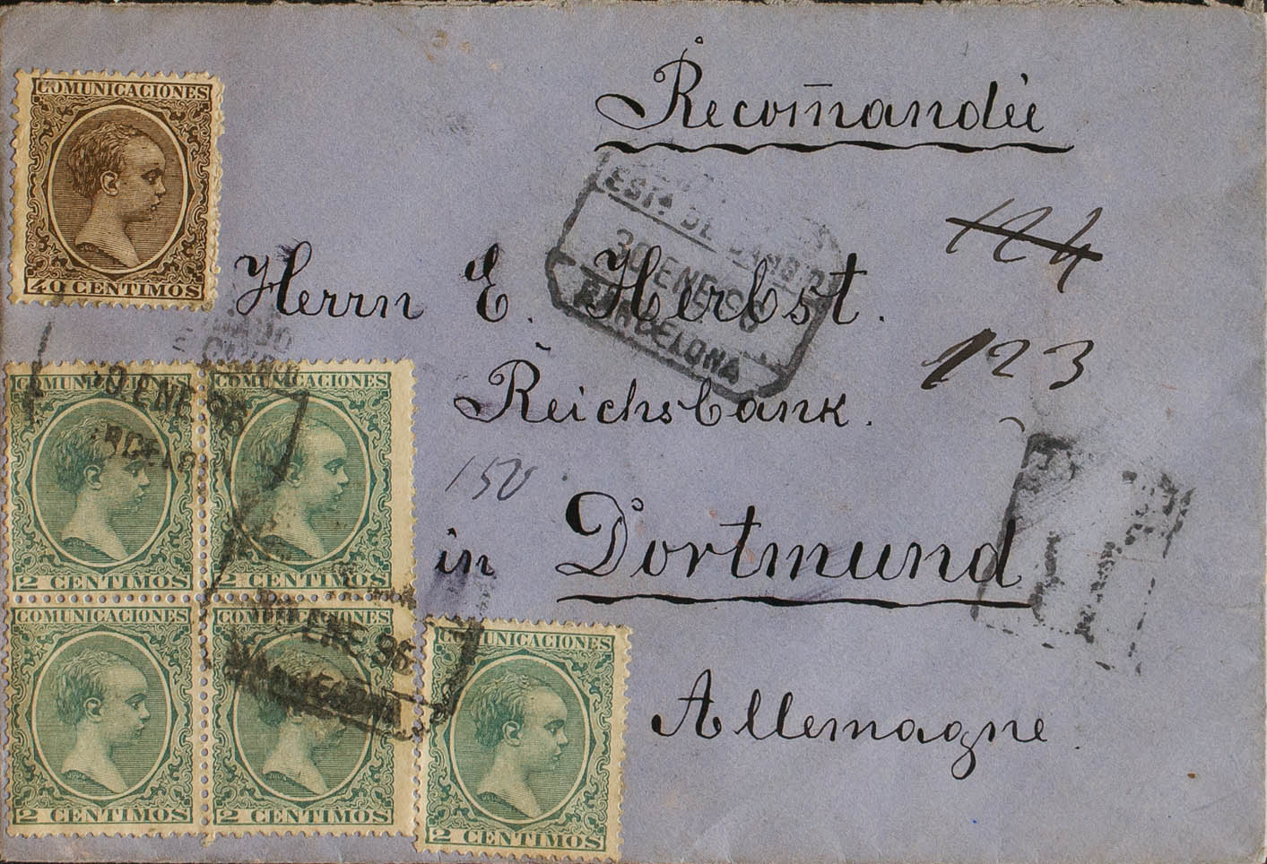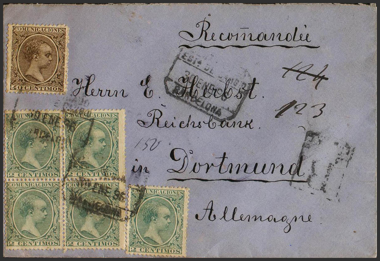 213(5), 223. 1896. 2 cts green, five stamps and 40 cts chestnut. Certificate from BARCELONA to DORTMUND (GERMANY). On the back arrival. MAGNIFICENT.