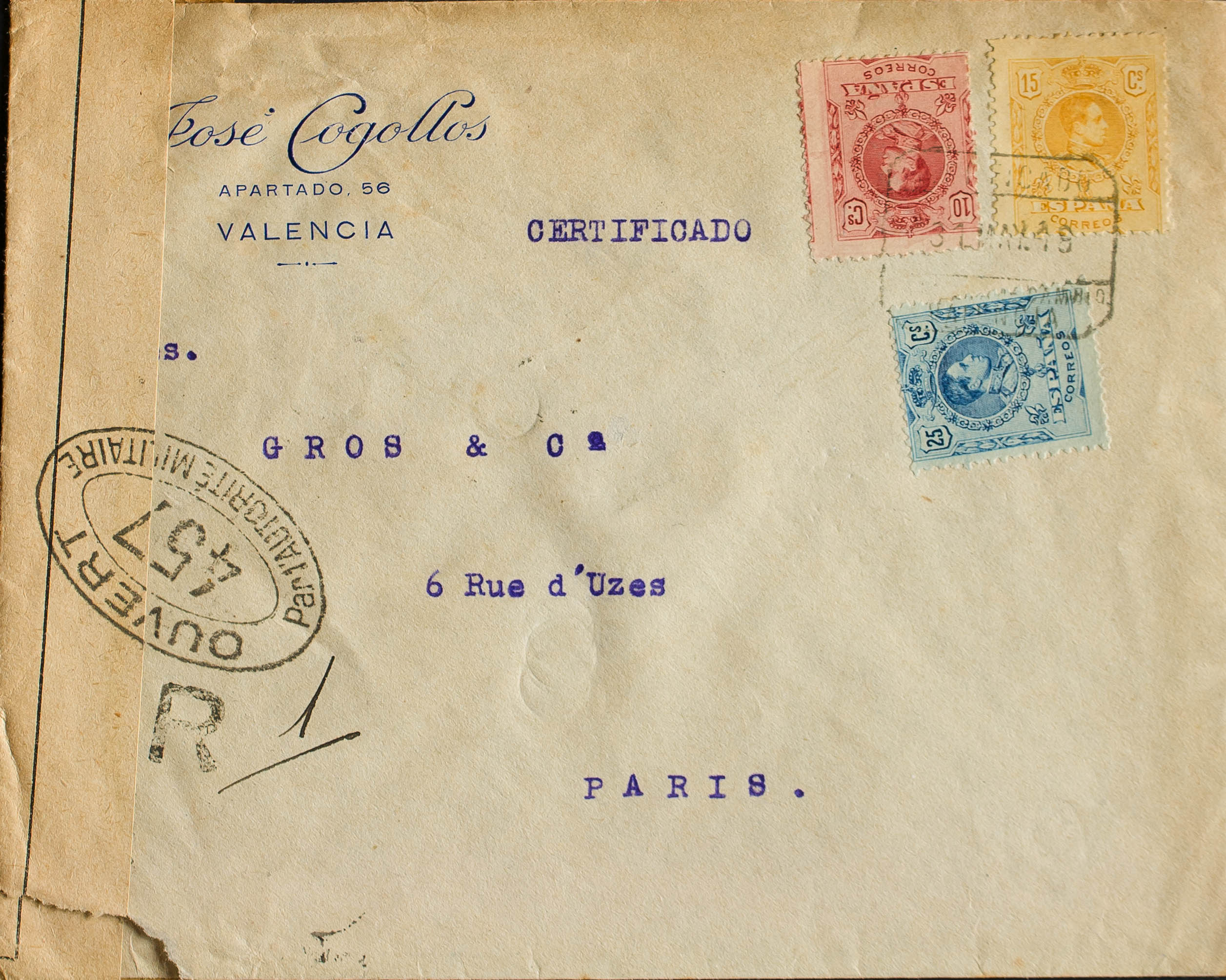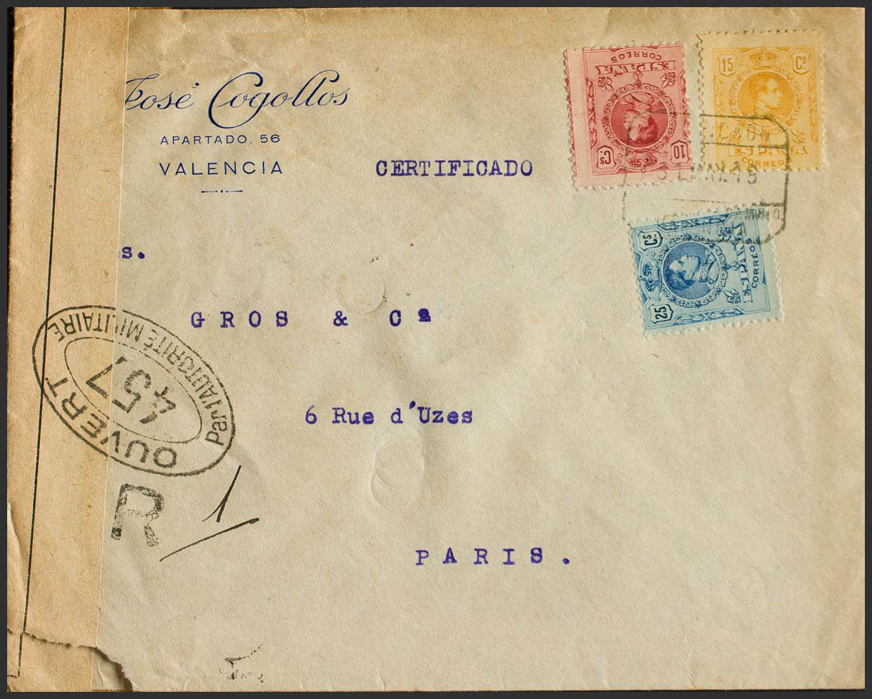 269, 270, 274. 1918. 10 cts, 15 cts and 25 cts. Certificate from VALENCIA to PARIS. On the back arrival. MAGNIFICENT.