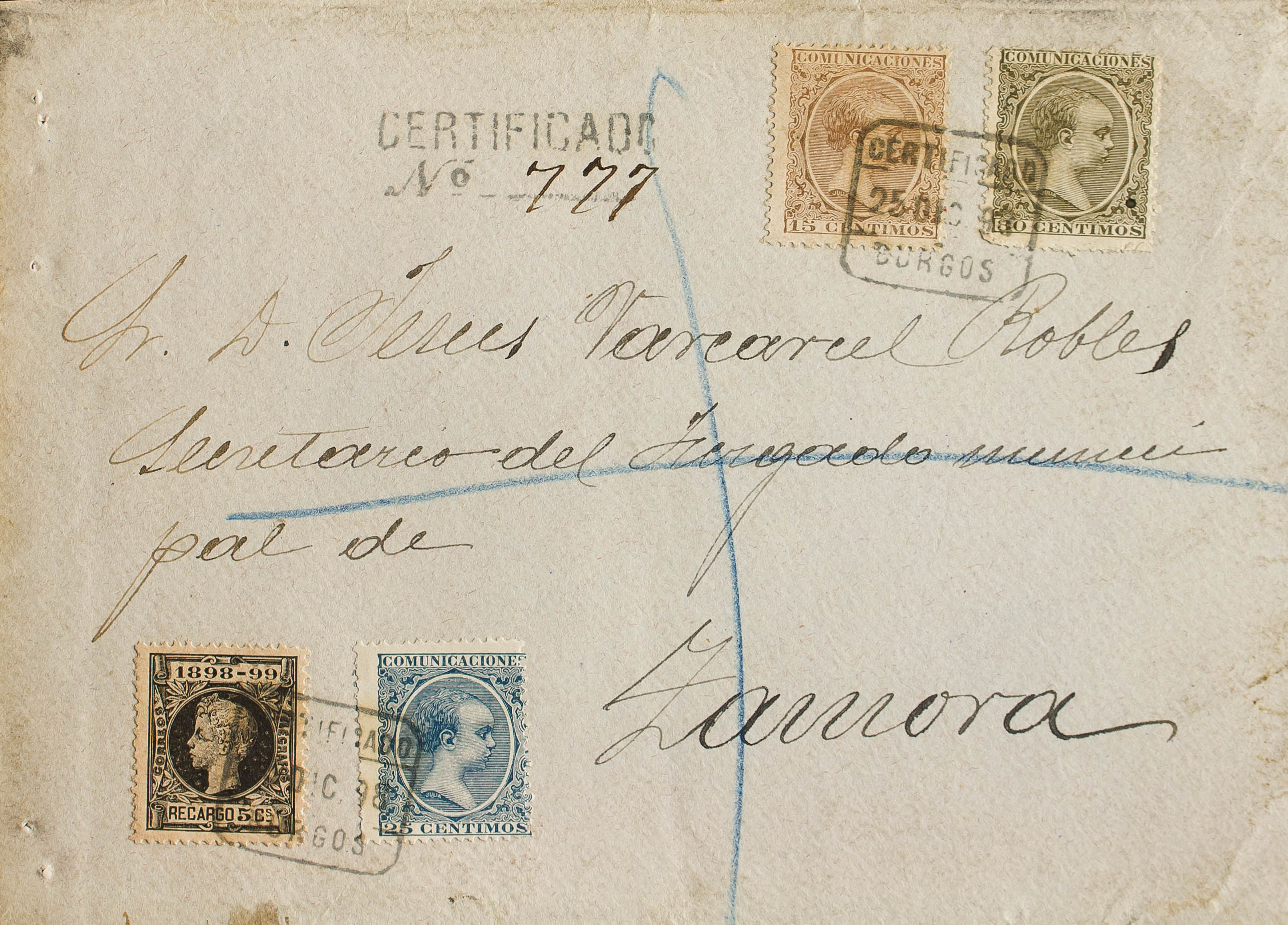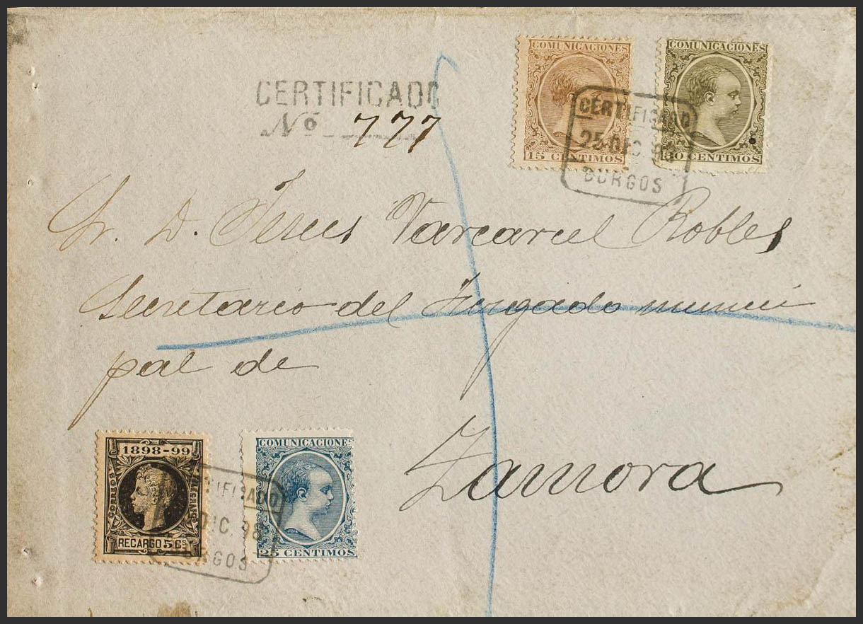 219, 221, 222, 240. 1898. Chestnut 15 cts, blue 25 cts, bronze green 30 cts and black 5 cts. Front of Certificate from BURGOS to ZAMORA. MAGNIFICENT.