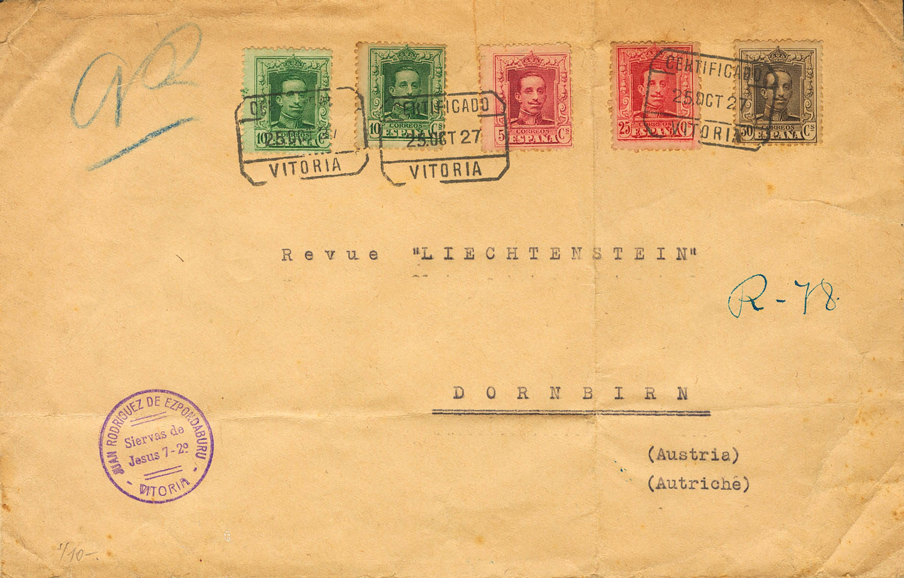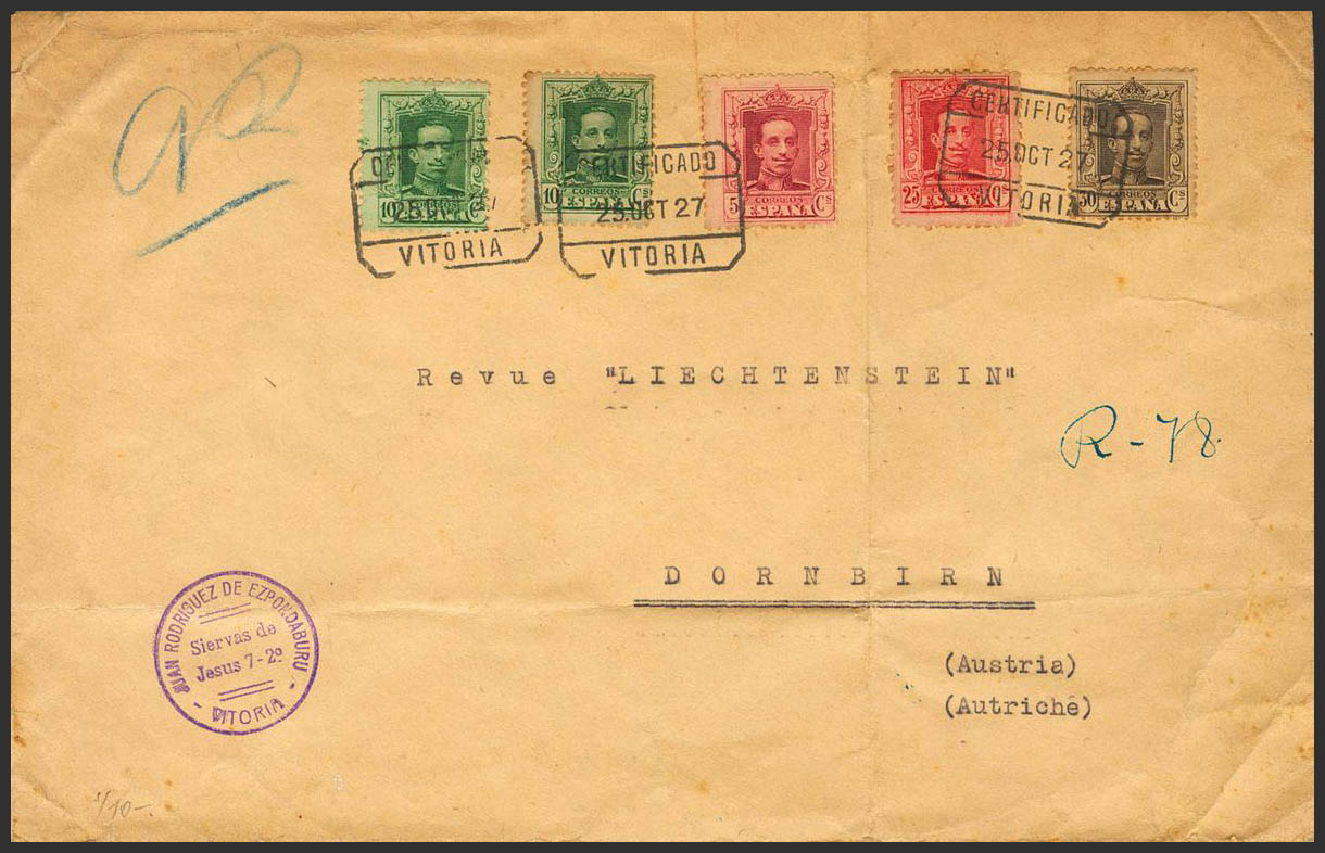312, 314(2), 317, 318. 1927. 5 cts carmine, 10 cts green, two stamps, 25 cts red carmine and 30 cts chestnut. Certificate from VITORIA to DORNBIRN (AUSTRIA). MAGNIFICENT.