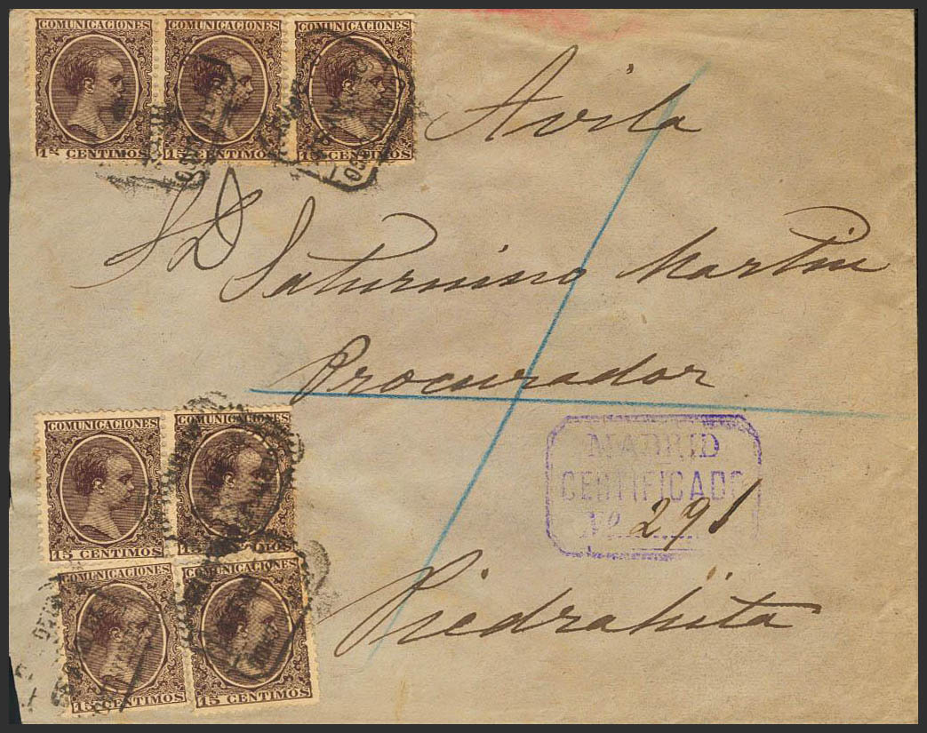 219(7). 1891. 15 chestnut cts, seven stamps. Certificate from MADRID to PIEDRAHITA. On the back transit. MAGNIFICENT.