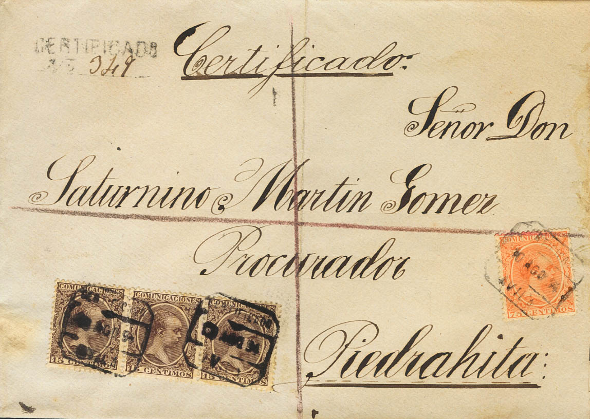 219(3), 225. 1894. 15 cts chestnut, three stamps and 75 cts orange. Certificate from AVILA to PIEDRAHITA. MAGNIFICENT AND VERY RARE.