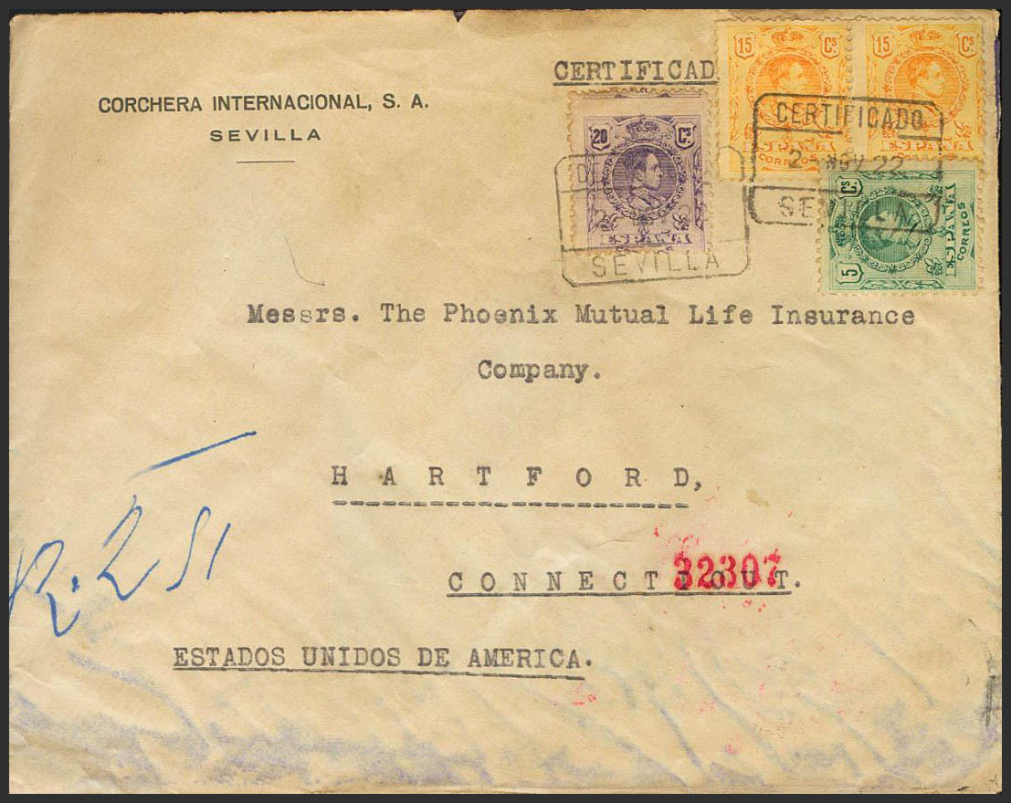 268, 271(2), 273. 1922. 5 cts green, 15 cts yellow, two stamps and 20 cts violet. Certificate from SEVILLE to HARTFORD (UNITED STATES). On the back arrival. MAGNIFICENT AND SPECTACULAR.
