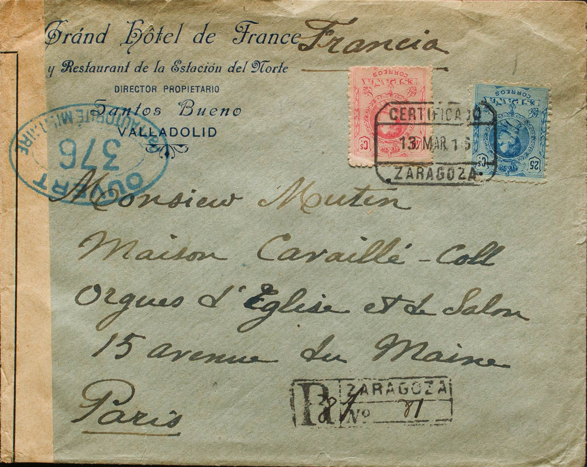 276, 274. 1915. 40 cts pink and 25 cts blue. Certificate from ZARAGOZA to PARIS. On the back arrival. MAGNIFICENT.