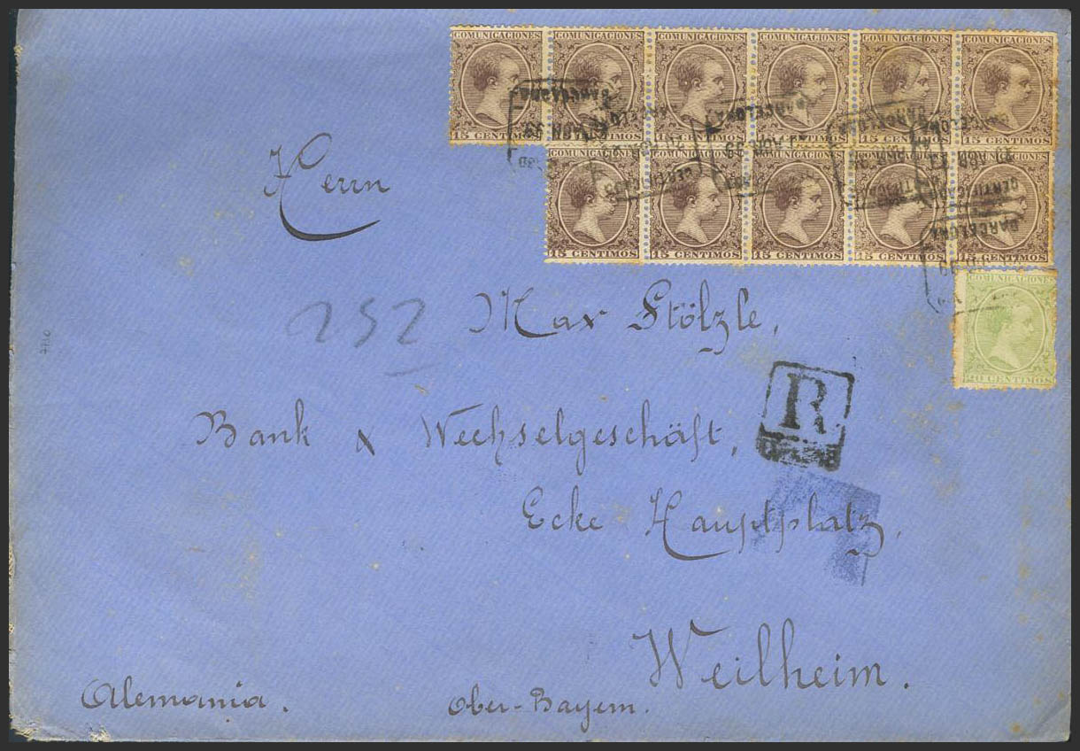 219(11), 220. 1899. 15 cts brown violet, eleven stamps and 20 cts green yellow. Certificate from BARCELONA to WEILHEIM (GERMANY). On the back arrival. MAGNIFICENT AND VERY RARE AND SPECTACULAR POSTAGE.